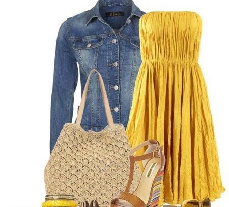Very successful urban image, created on the basis of the most simple yellow sundress. A denim jacket adds boldness and freedom to this look, bright notes are hidden in the shoes, and a bag with an openwork pattern brings a touch of retrostyle. This image can be easily taken note of and used for walking with friends, shopping and other pleasant pastime.