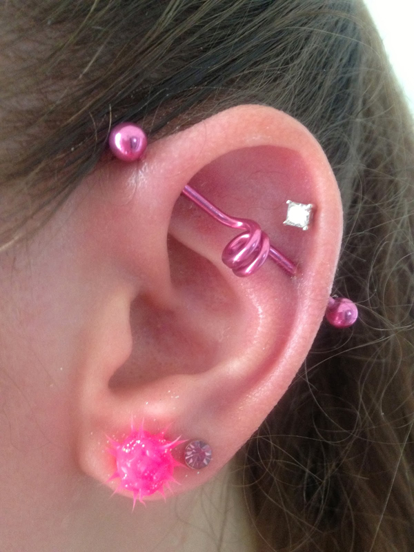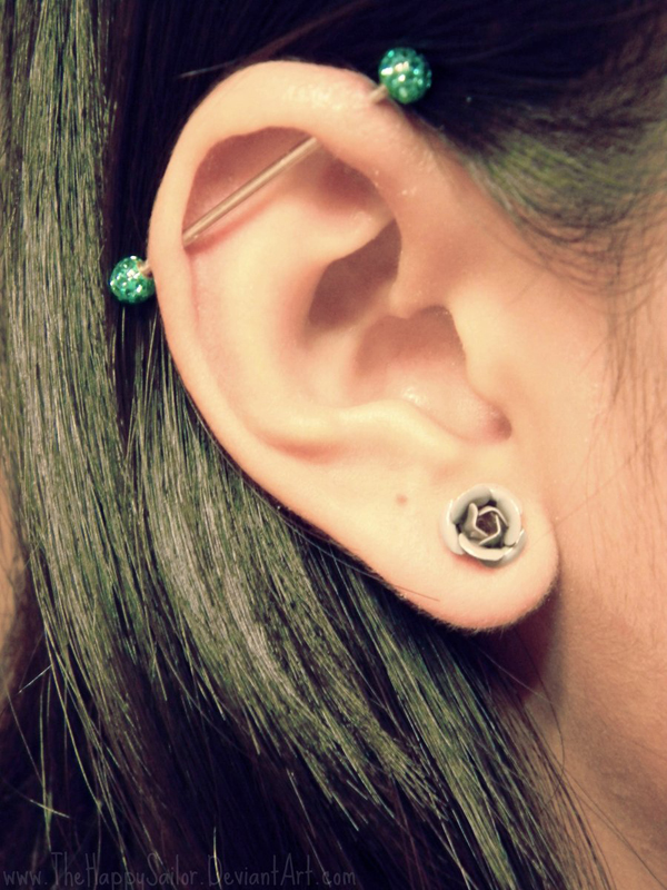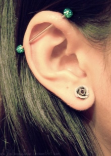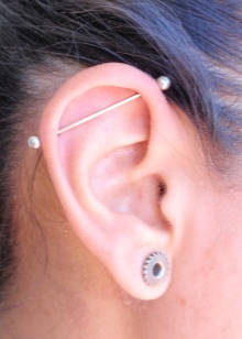 - Another interesting type of ear piercing is Industrial. It has two holes that are connected by one earring. As a rule, a similar puncture is made on the upper portion of the ear. Here the bars having the various form of the basis will be pertinent.