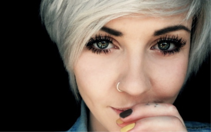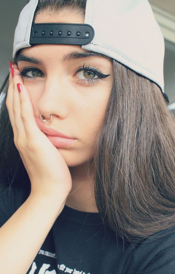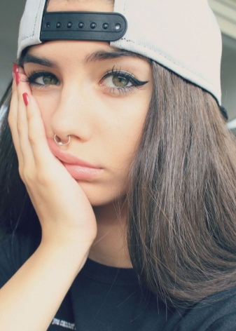 Girls often turn to a nontrivial nose ring. Such an original detail will look harmoniously with a regular black T-shirt, a light baseball cap and skinny jeans. Add an attractive arrow on the eyes.