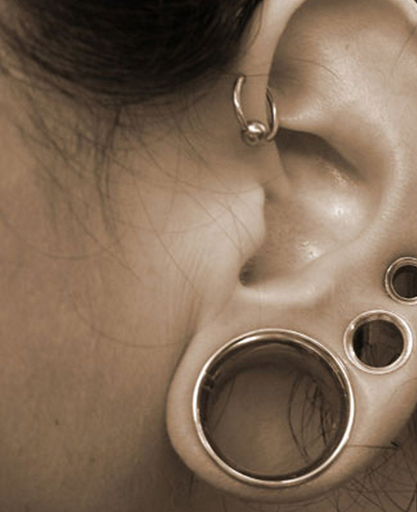 - Original ear tunnels can be used for earlobe piercings. Special stretchers form large holes that are complemented by various earrings or tunnels.
