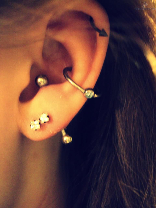 A beautiful ear piercing will look great with many evening ensembles, especially if it is supplemented with a regular earring. Effectively in such a set will look a high hairstyle, exposing the ears.