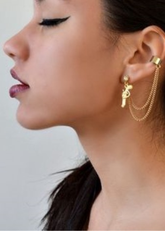 For casual style, it is better to pick up dangling earrings with loop fastener or cuffs. The last version of the decoration consists of a clove inserted into the lobe and a half ring attached to the upper part of the ear.