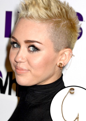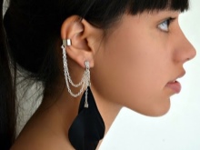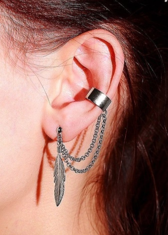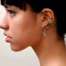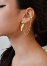 - Another type of these earrings is a product for people with pierced ears. Moreover, some cuffs have cloves for 2, and even for 3 holes. One or several parts of the earring is inserted into the punctures, while the upper part is attached to the outer edges of the ear. All these fragments are interconnected by means of chains, threads or openwork arches. It looks very beautiful. Punctures in the ear will also be needed by those people who are used to walking in headphones. After removing them with careless movement, you can accidentally catch an earring and lose it. In cold winters, when without a headdress and a scarf wound around the neck, you cannot even stick your nose outside, it is also prudent to wear cuffs with a puncture.