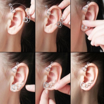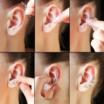 Cuff earrings are usually attached with a special clip for a bunch or outer curl of the auricle. Metal attachment is very malleable and allows you to fit the jewelry to your ear so tightly that the possibility of losing it is almost zero. However, the mounting mechanism is almost not noticeable, and therefore does not cause any discomfort.