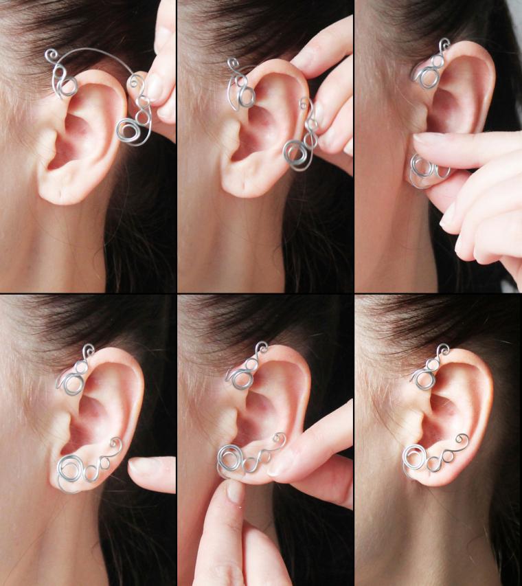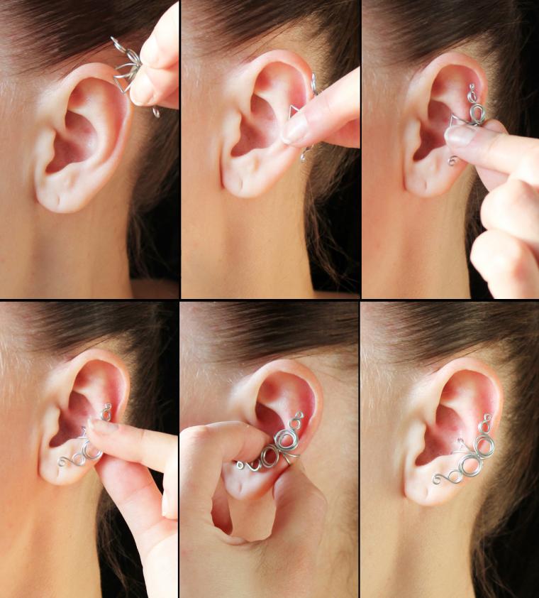 - Cuffs with a special handle, which clings to the ear so that the attachment imperceptibly also enjoy success. For others, it remains a mystery how the earrings are kept on the ears. The handle is so invisible that it seems as if the decoration is simply glued to your whole ear. From the side it looks very impressive.