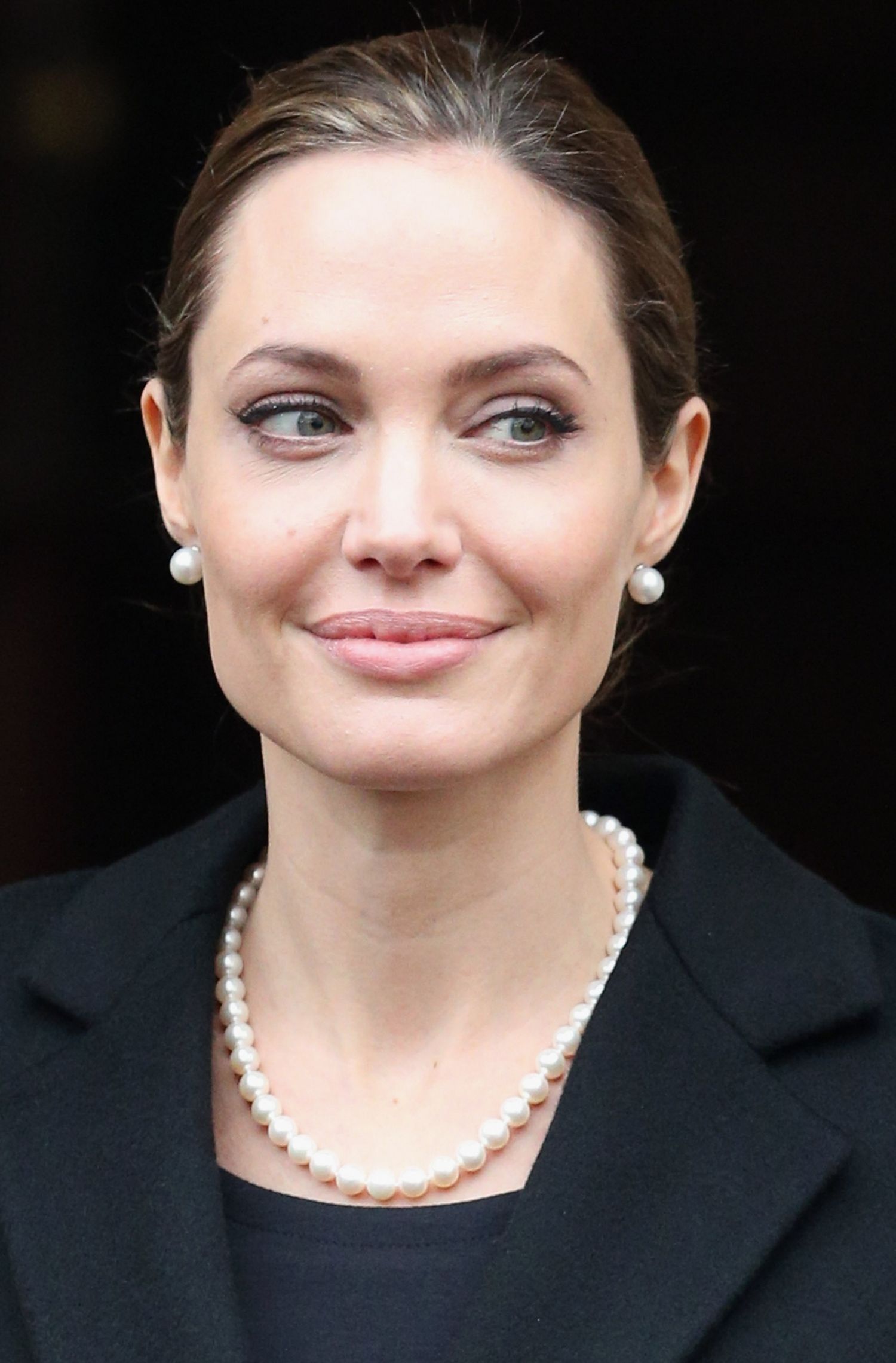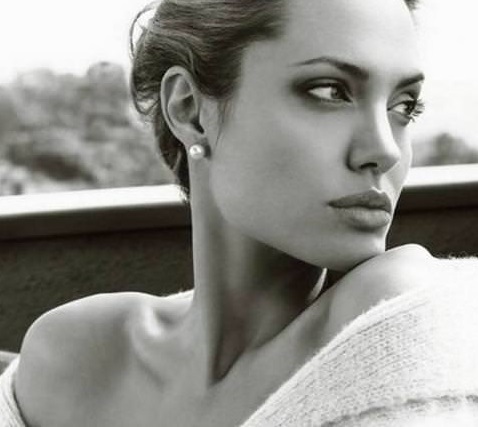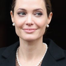 - Angelina Jolie loves to create elegant and feminine images that emphasize her slim figure. The actress prefers to decorate such ensembles with laconic pusets of light colors. Especially harmoniously such decorations look in tandem with white and beige beads.