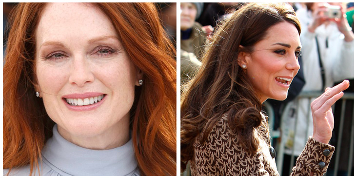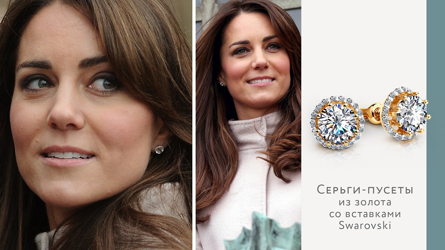 - The Cambridge Duchess Kate Middleton prefers to wear small gold studs, complemented by the usual Swarovski crystals. They look on it very harmoniously and emphasize the correct facial features.