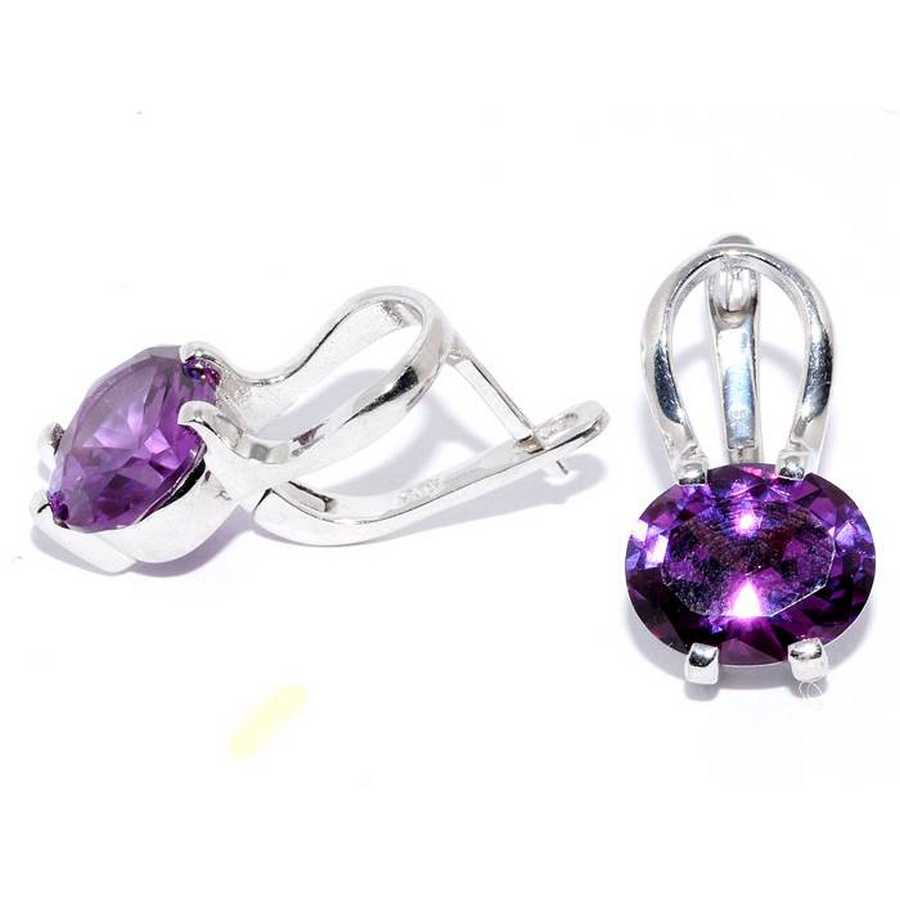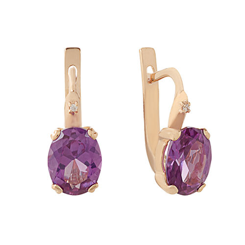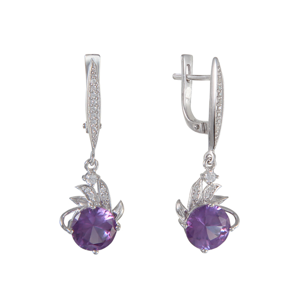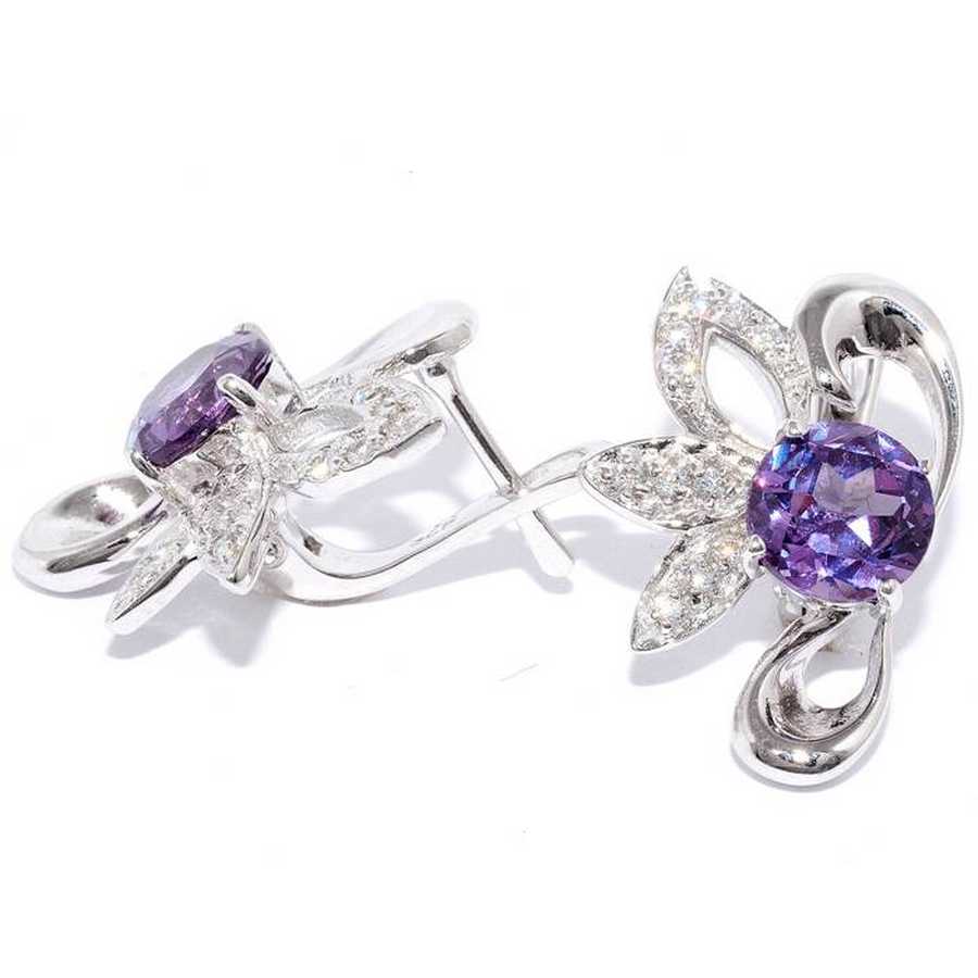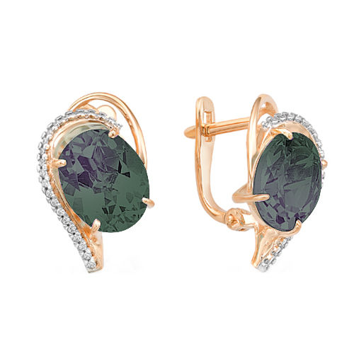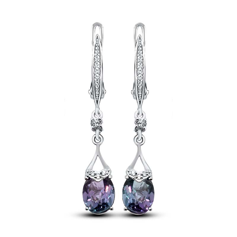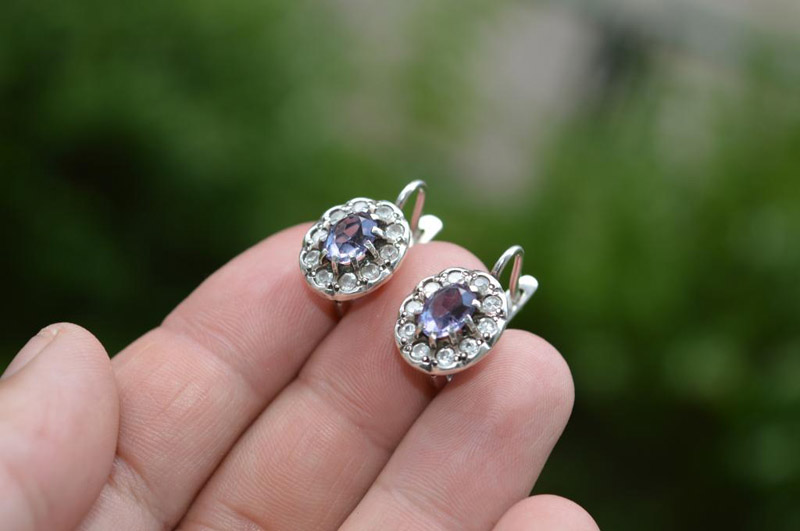 On sale you can see earrings with synthetic alexandrites in silver. Silver earrings are presented with a large number of options. This earrings with pendants, and models with a large rounded stone in the frame. This gem rarely goes in combination with other types of stones, with the exception of cubic zirconias, for models of gold - the same cubic zirconias and diamonds. Small cubic zirconias frame the central stone and serve as a kind of background for it.