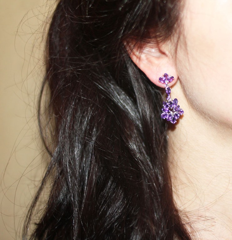 Amethyst jewelry, including earrings, is usually recommended to be stored in jewelry boxes, away from sunlight. Keep in mind that the color of the stone may become less saturated under the influence of ultraviolet radiation. This property should be taken into account when wearing earrings.