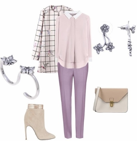 - Office or city option. Neat jewelry with silver, which has an almost matte surface, was selected for the classic style of trousers and blouses. Thanks to small stones and overall restraint in the performance, accessories look elegant, being the highlight of the whole image.