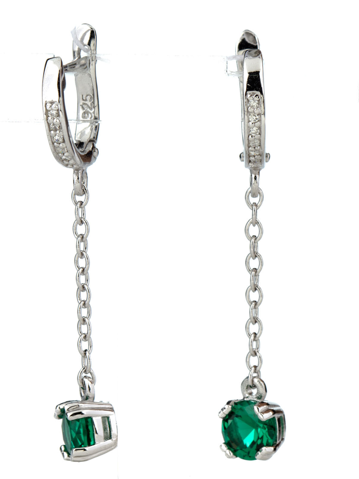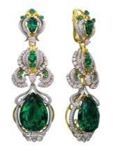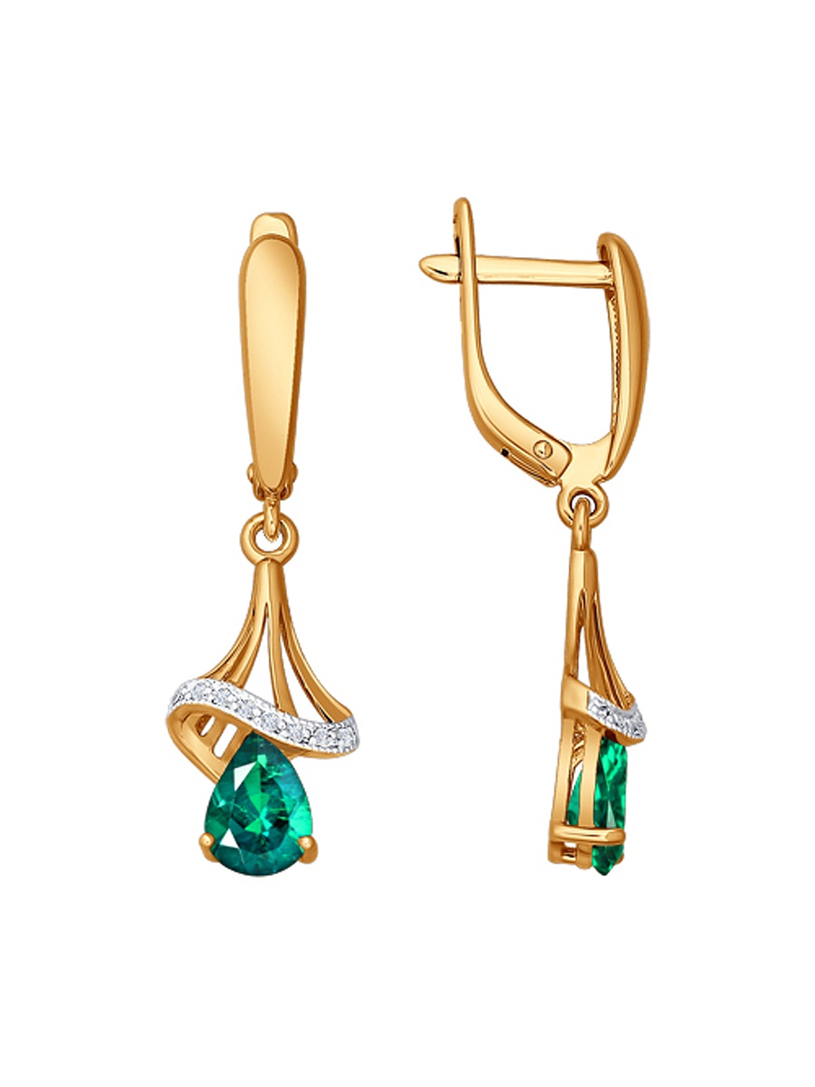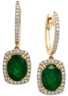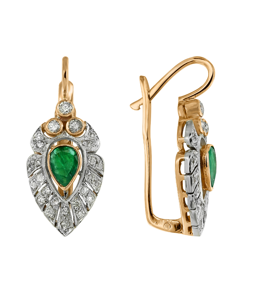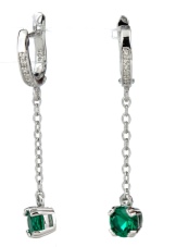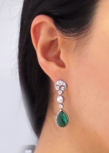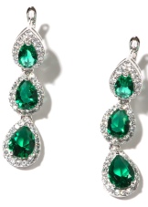 - Long earrings with pendant. Mostly they have a stud fastener and are decorated with two stones. The most fashionable version of such earrings is when the earring is decorated with a round emerald, and the pendant is drop-shaped emerald.