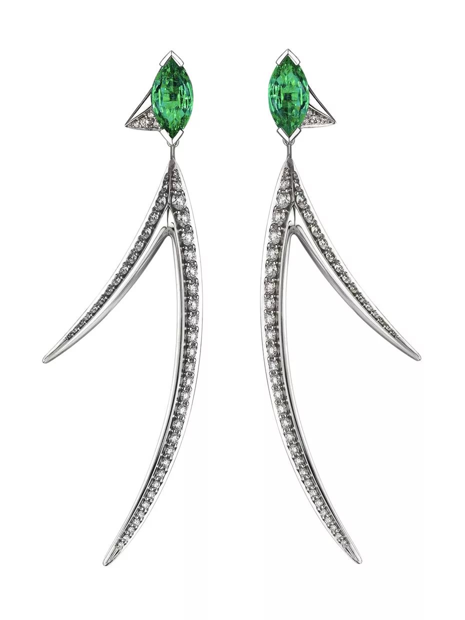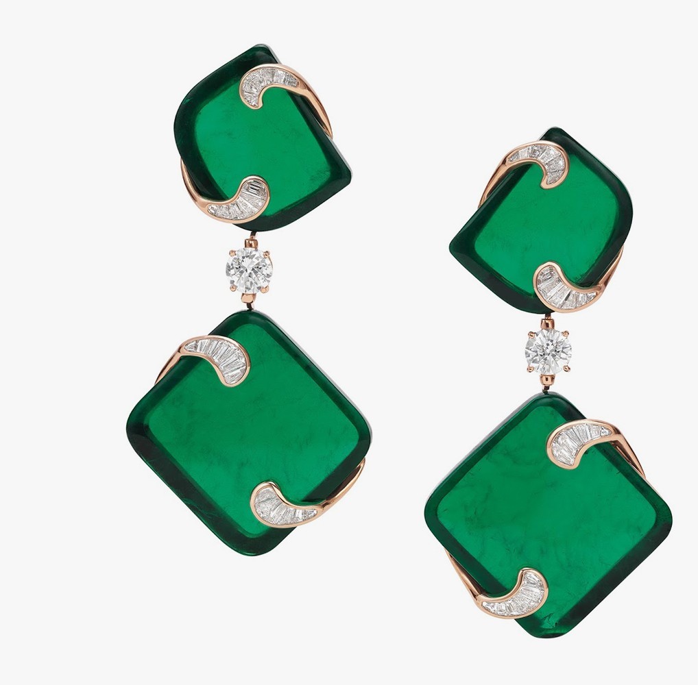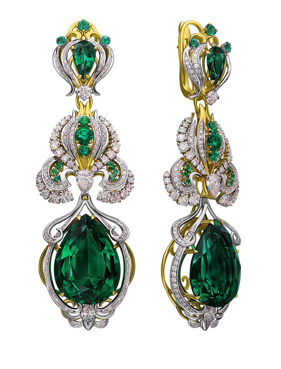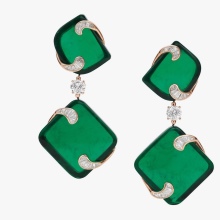 - Long earrings with pendant. Mostly they have a stud fastener and are decorated with two stones. The most fashionable version of such earrings is when the earring is decorated with a round emerald, and the pendant is drop-shaped emerald.