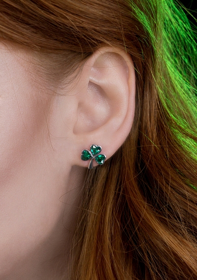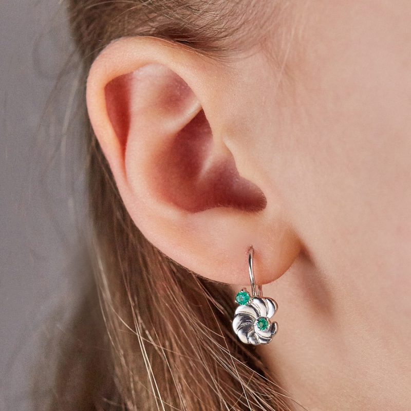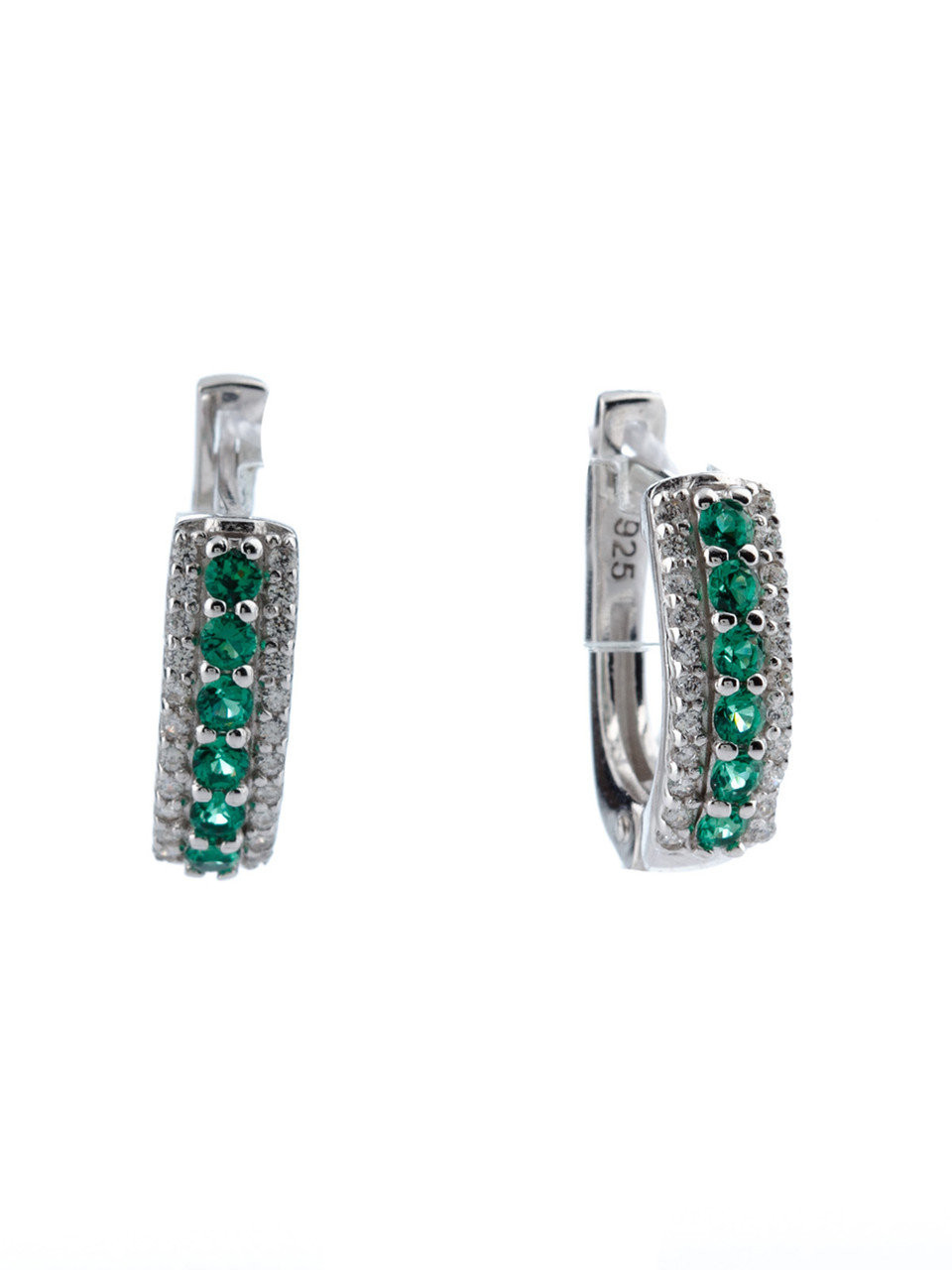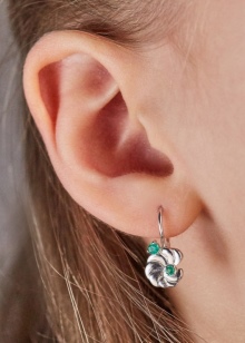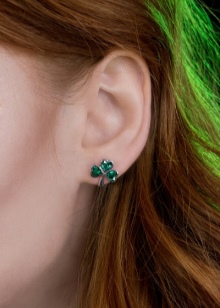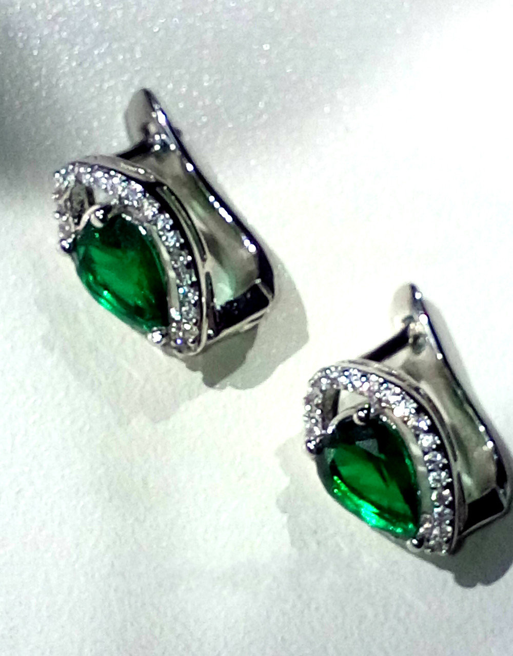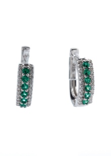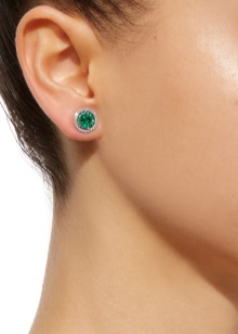 - Stud earrings are cute and simple, modest, but at the same time giving a highlight to their owner. The stone in them can be either without cut in general, or with a cut, usually a “rose”. If not cut, then it resembles a slightly clouded crystal.Other, smaller crystals, usually transparent: diamonds or zircons are often added to the faceted emerald. Such earrings can be made of gold and silver.