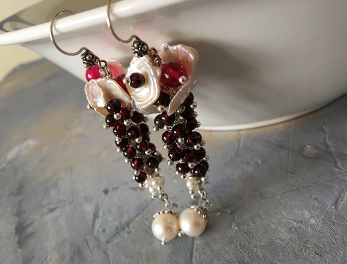 Like many beauties will have a variety of colors in jewelry with this mineral. Earrings with white pearl elements are the most common.