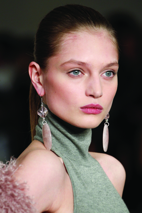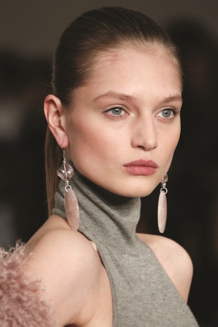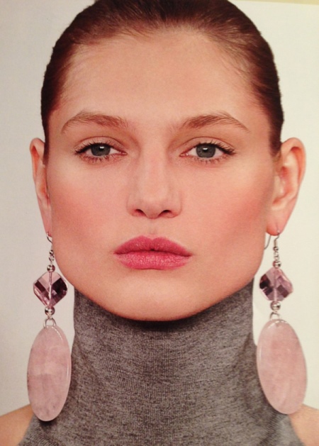 - Elongated earrings with pink quartz and cozy autumn clothes: coats, skirts and warm scarves will look very impressive and romantic. A scarf should be chosen in the shade that would fit the stone on the accessories.