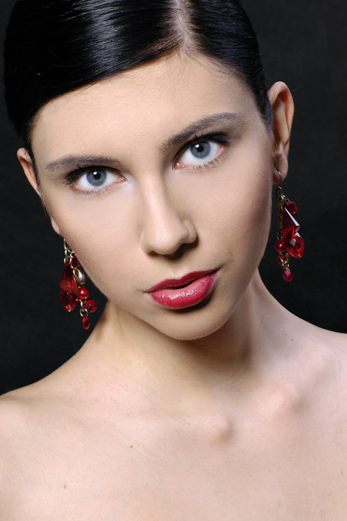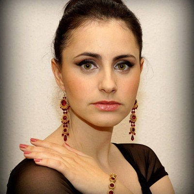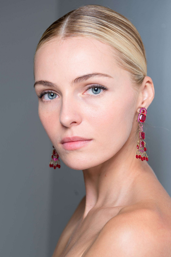 - Bright brunettes with a light skin tone can freely choose gold earrings with a rich ruby.