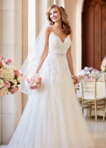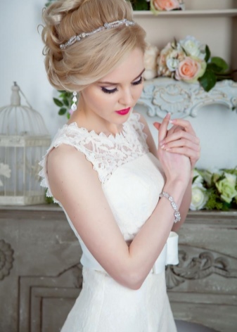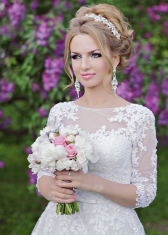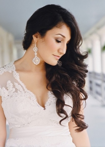 Important is the type of neckline wedding dress. For a dress with a deep neckline, you can choose earrings of any shape and size. If the outfit has a collar or volumetric decor near the neck, then only small, elegant jewelry will do. Big earrings will not only be uncomfortable, but will also add piling up.