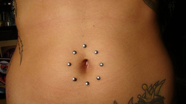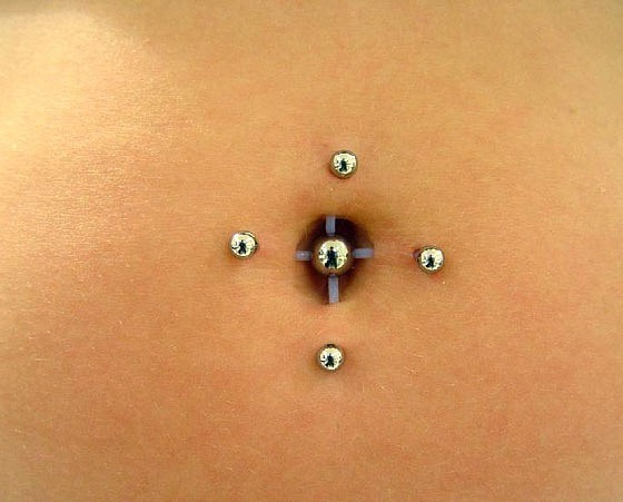 The original type of piercing in the navel. Instead of the classic earrings used microdermal. This is a kind of bar, one end of which remains hidden from view. An “anchor” is implanted under the skin with a small rod on which the desired element is wound. From microdermals, you can make the whole composition on the skin. The technology of implanting this kind of jewelry allows you to wear them literally on any part of the body.