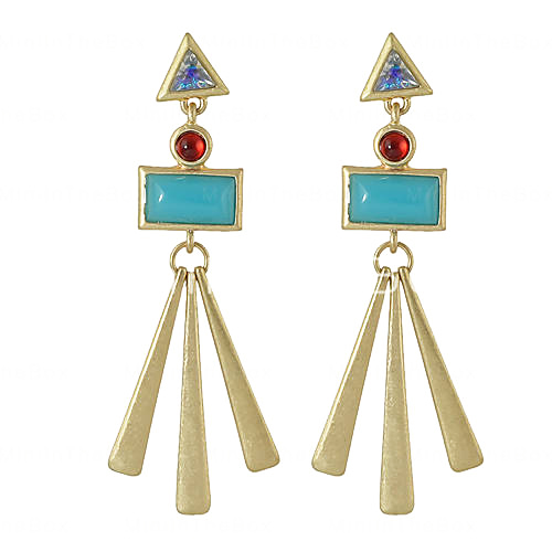 These earrings consist of several geometric shapes. They can be completely different and are often complemented by multi-colored details: stones or plates.