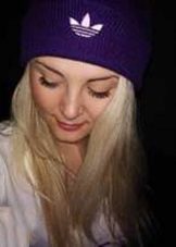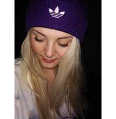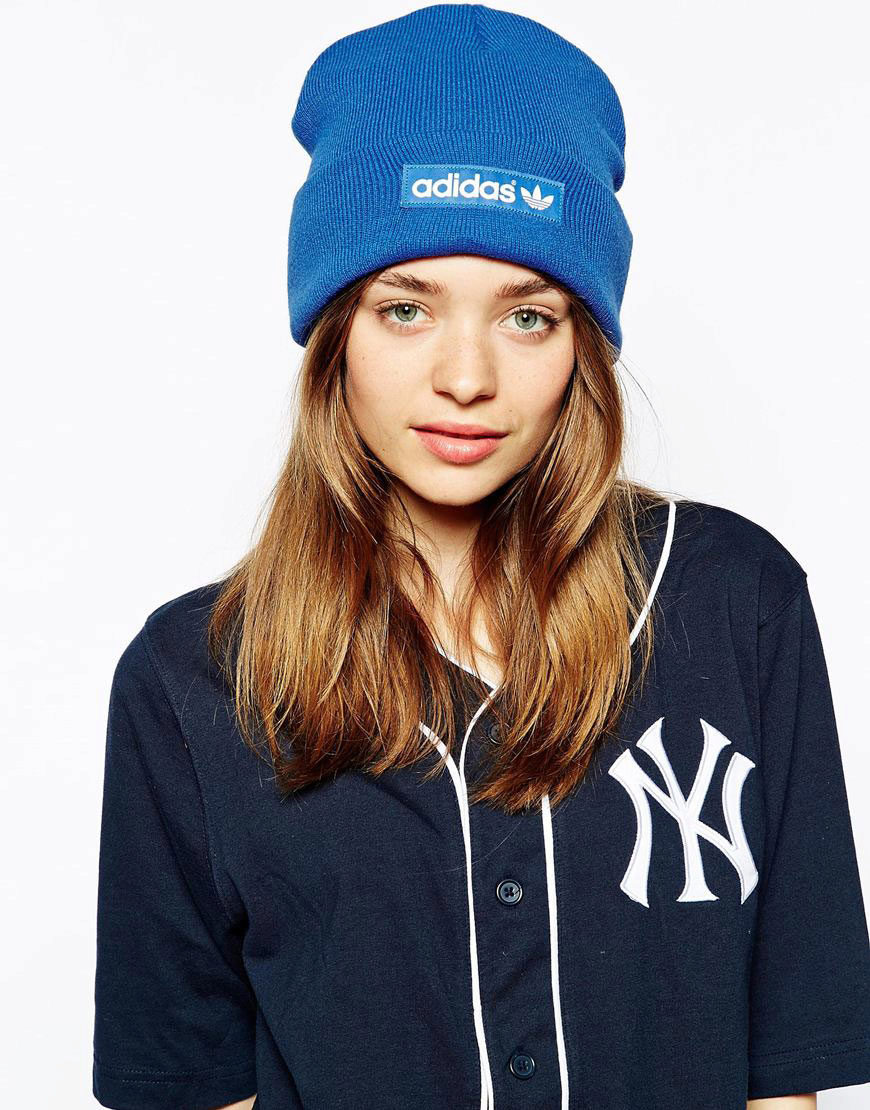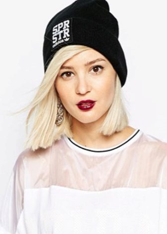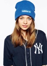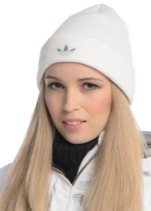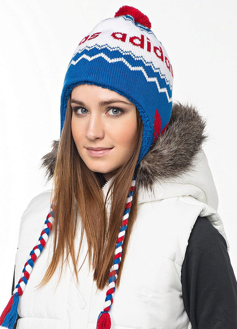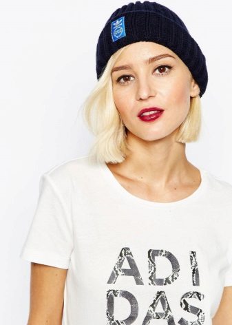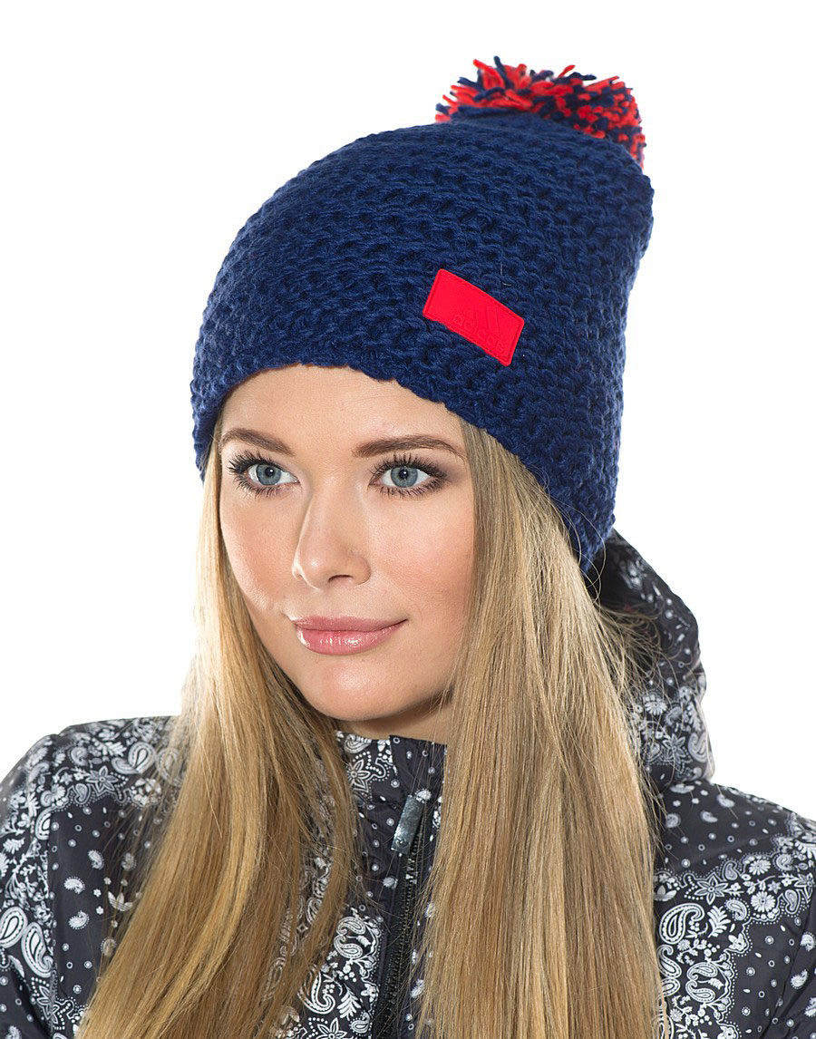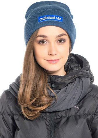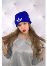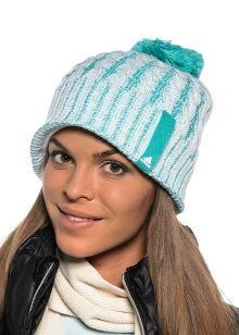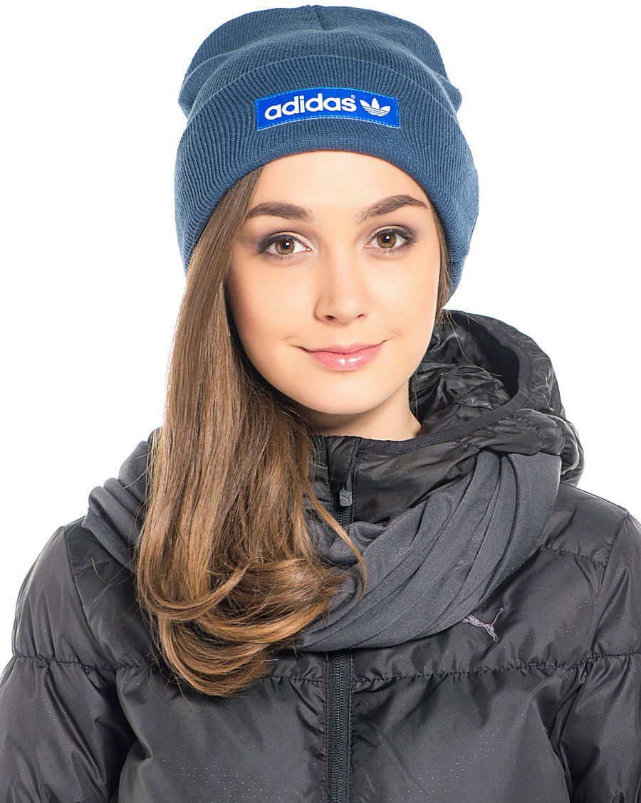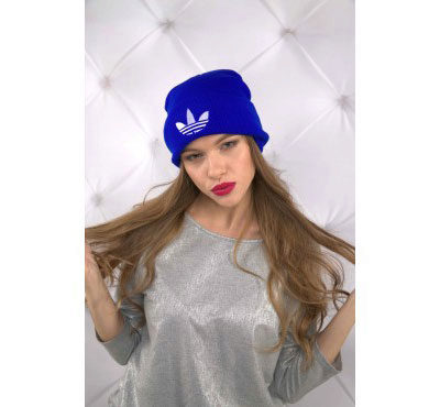 Women's Adidas knitted hat (although a man could wear a similar model) has a sports orientation. This is a model with a wide cuff, patterned elastic and decorated with a brand emblem in front of the white trefoil, which is crossed by narrow stripes. The headdress of a beautiful blue shade is combined with the color of the girl's eyes and echoes the tone of a turtleneck. The cap is combined with a down jacket of olive color and sporty style. However, white fur trim outerwear, loose long blond hair and flawless makeup make the image more feminine.