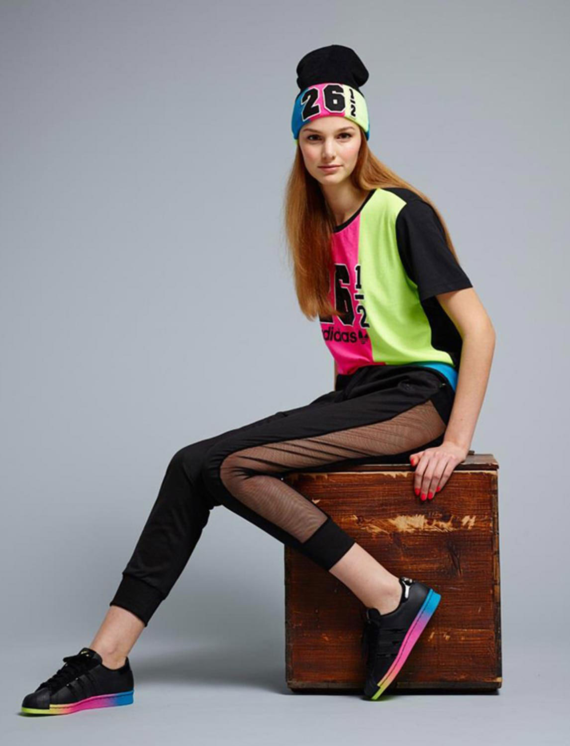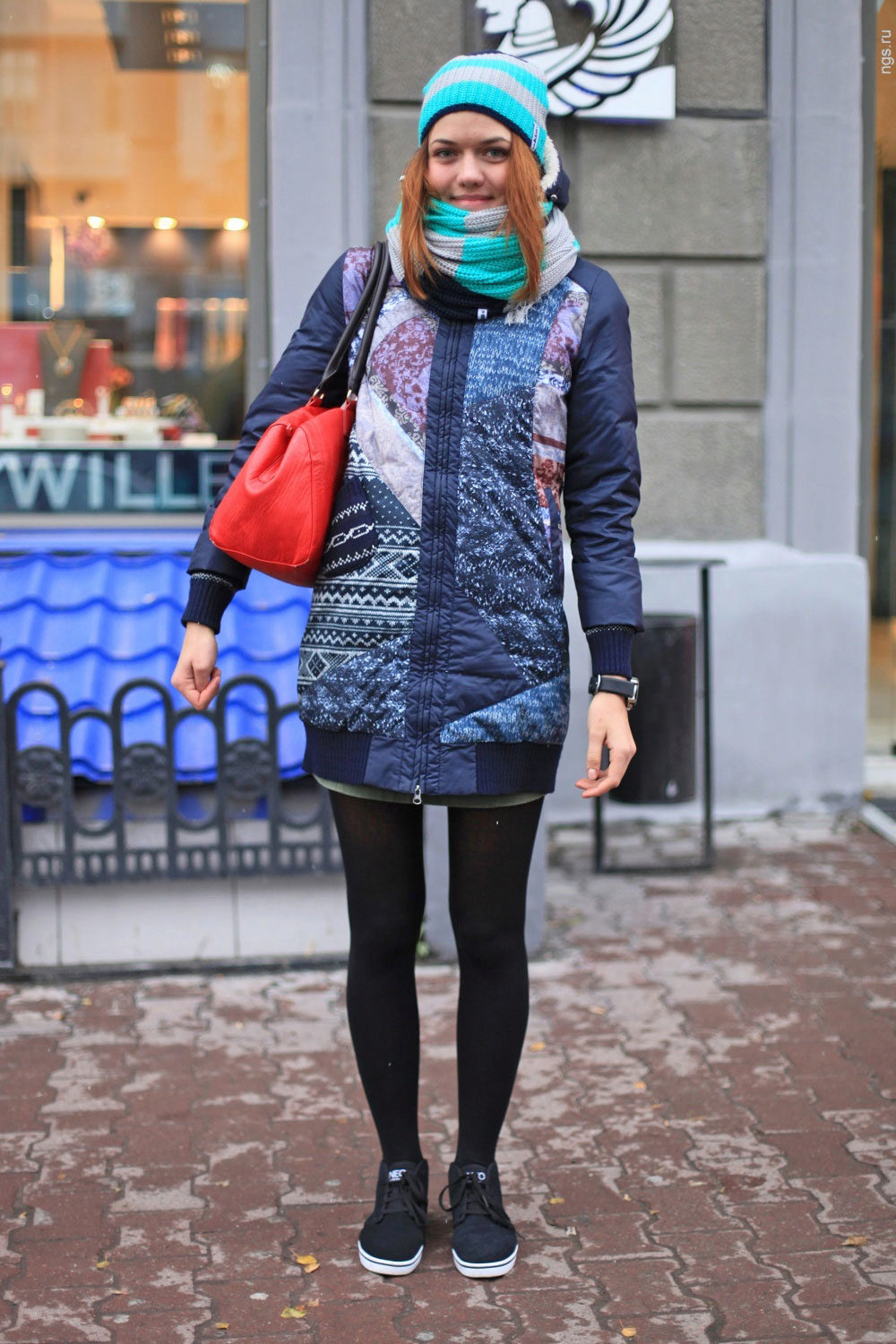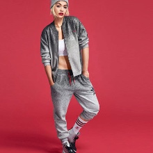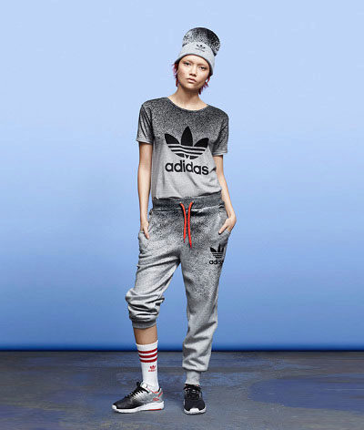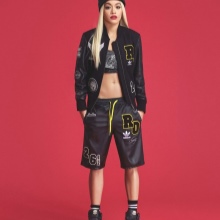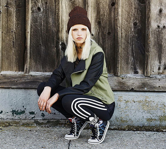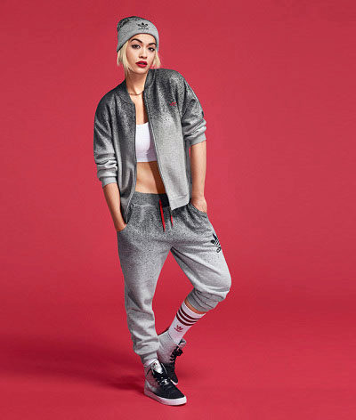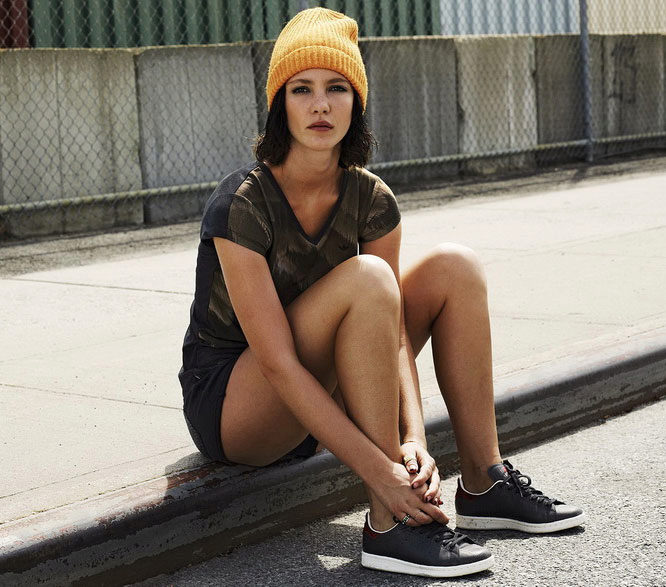The adidas stylish knitted hat-bini is decorated with a neat pompon and has a spectacular pattern of large braids. The volumetric model is appropriate for a girl with large features (full lips and big beautiful eyes). The product has a wide lapel, knitted with a rubber band, and is decorated with a small metal trefoil, which echoes the shiny steel shade of the jacket. The bright orange color of the cap, which matches the color of the hair and skin of the girl, brings a bright note to the image.