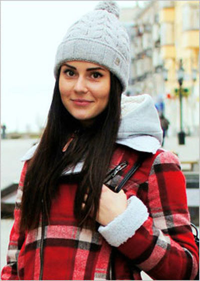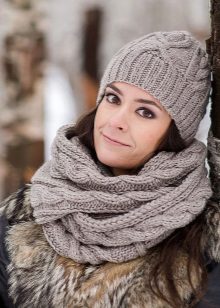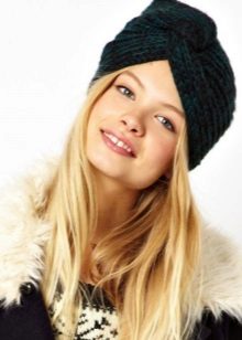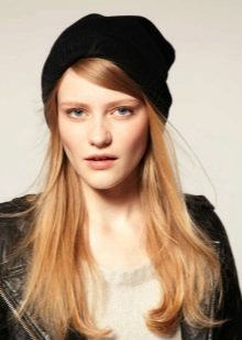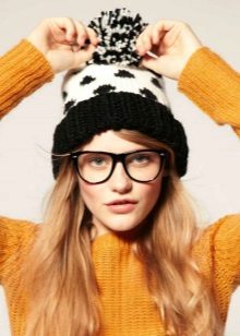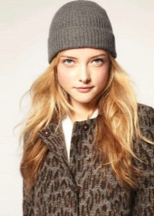 The thin knitted unisex pattern is distinguished by a contrasting color range - bright orange stripes on a black background. Such a model looks harmoniously on a dark-skinned girl with expressive facial features (otherwise they will simply be lost against the background of the cap). The white edging of the cap emphasizes the beautiful color of the skin, combined with a light trim of the collar and gray sleeves of outerwear. Long, dark hair lends a sporty touch to a sporty look.