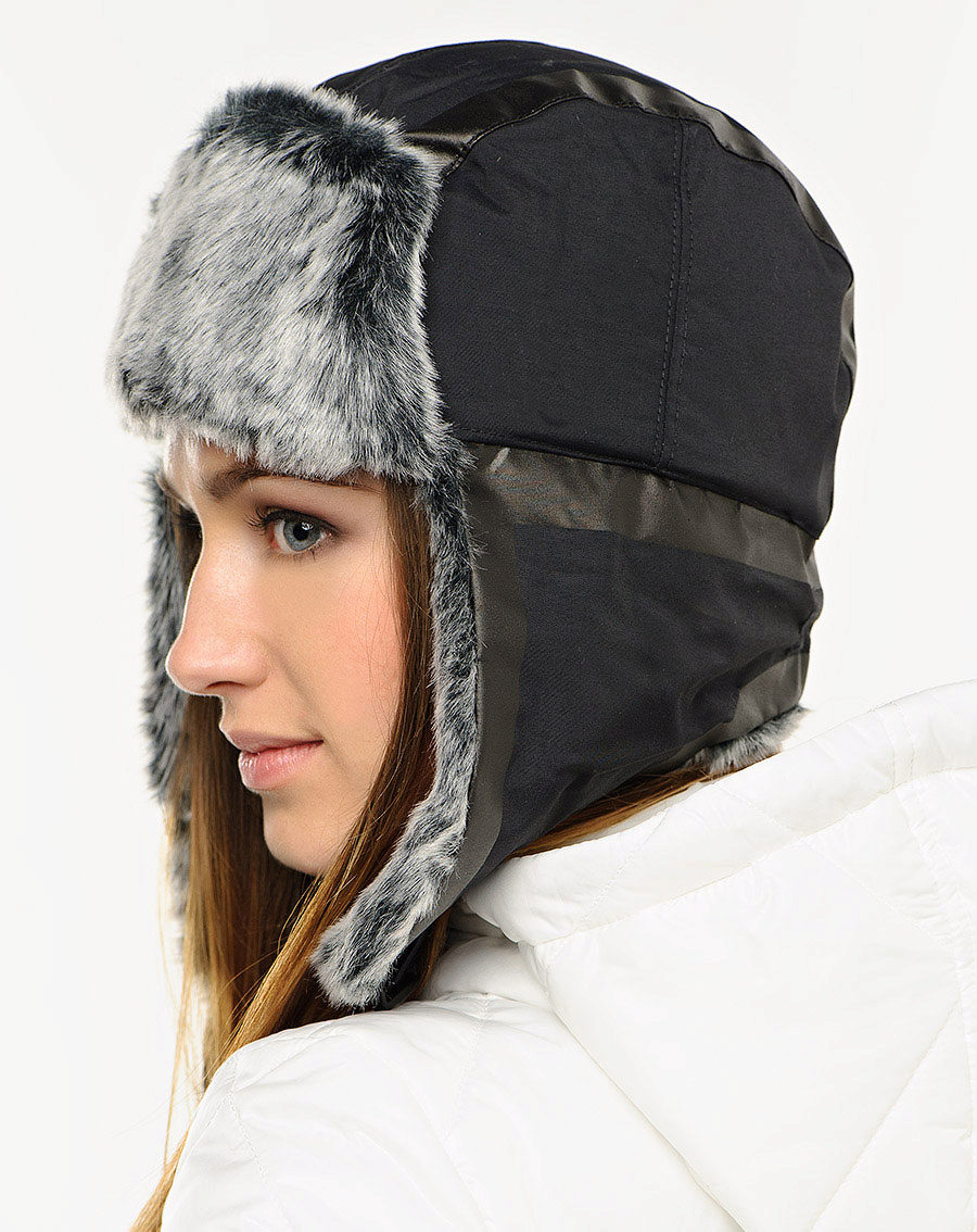 - Women's earflap hat with visor Stellasport, developed in collaboration with British designer Stella McCartney. The model of free cut is equipped with a strap under the chin, fastened with velcro, as well as inserts for additional protection of the ears. The cap has a lining of soft plush fleece in a contrasting color.