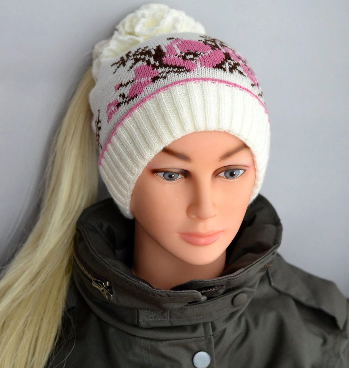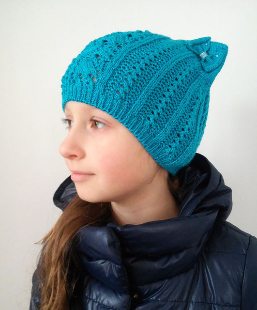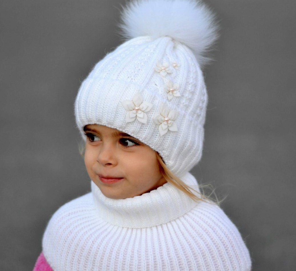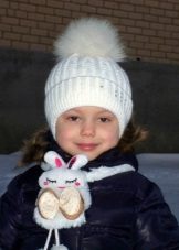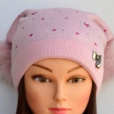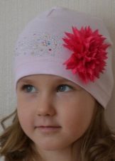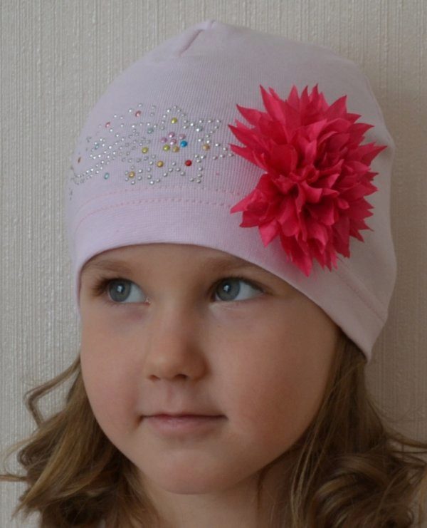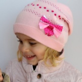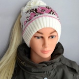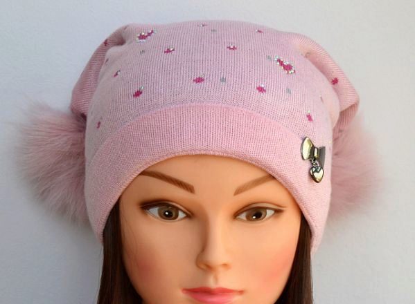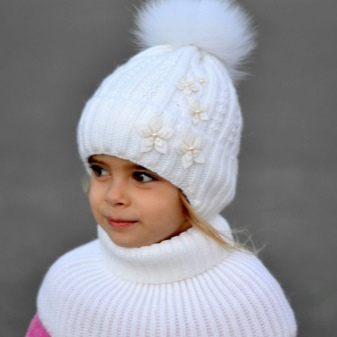 Models for girls are characterized by an abundance of decor. Of course, these are flowers, which can be a whole placer, or brilliant rhinestones. It looks interesting winter model with a pompon of pink color, in which a white flower is sewn from similar yarn, and its leaves are knitted on the canvas’s hats (using a combination of facial and purl loops).