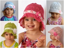 The collection also includes children's hats for the summer. Purely girlish option - lace knitted panama, decorated with satin bows, delicate flowers of contrasting yarn. Baseball caps are designed for both girls and boys. They have a distinctive color and decor: some are made in red and pink colors and have a distinctive decor, while others are decorated in blue and white and decorated with purely boyish emblems - imitate anchor, cars, spiderman.