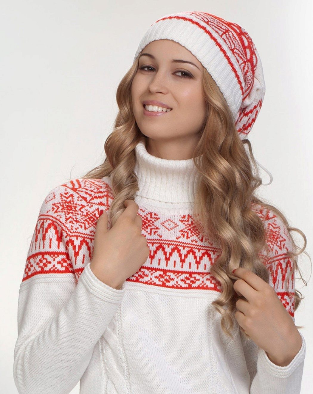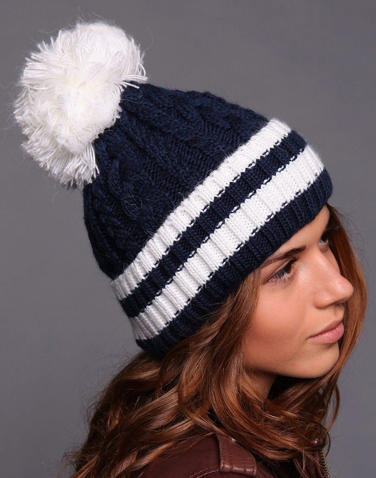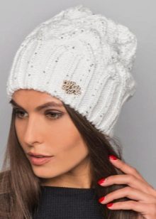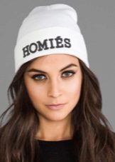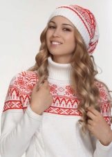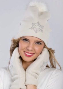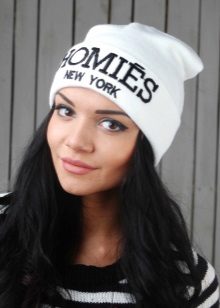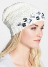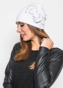 Although we are talking about white hats, this does not mean that everything is limited to monotonous monotony. Two-colored hats are common, especially in combination with blue, red, brown colors. This can be a simple pattern of alternating stripes or patterns, for example, Norwegian. Diversity and achieve decorative elements: colored pompoms, embroidered emblems and phrases, ornaments of rhinestones and stones.