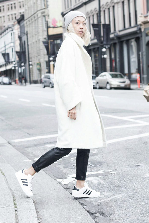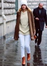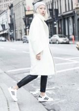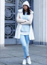 One white object in the image does not exclude the use of this color in other things, for example, in sweaters and sneakers. Gray onion jeans and a beige coat with short sleeves and large lapels will be diluted with a bow. As an accessory, you can use a simple pendant in the form of a large silver chain.