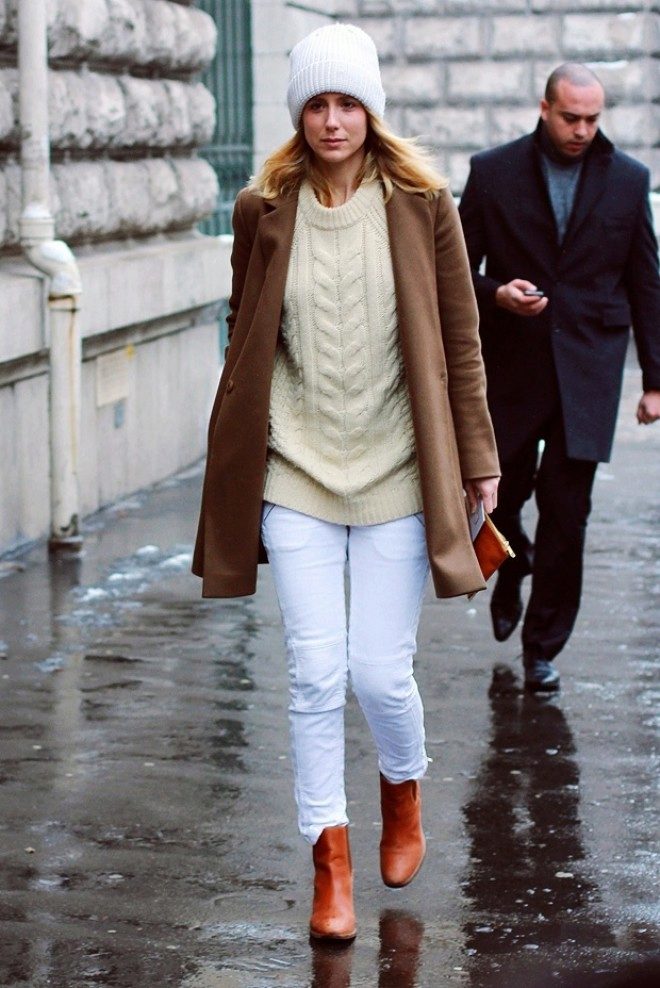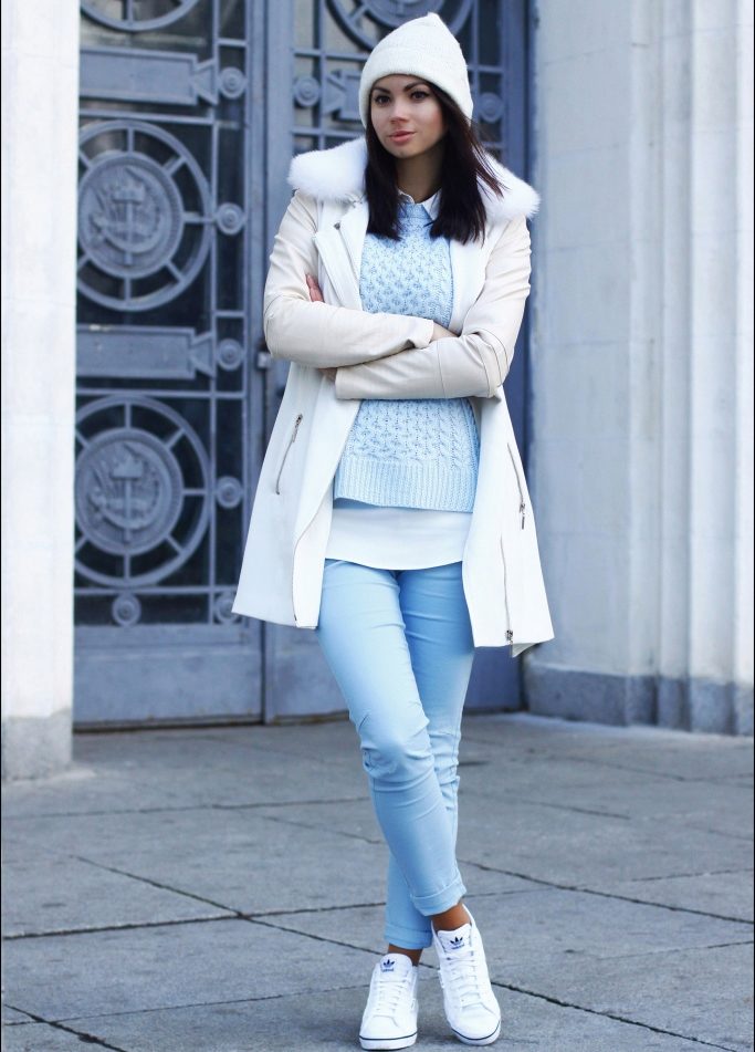 White color, regardless of shade, is universal. It combines with any other color, complements it, dilutes or makes it more saturated. However, it is believed that the greatest harmony lies in the combination of white with blue, red or black. It combines white and white, creating a winter fairy image, for example, thanks to a combination of hats and jackets.