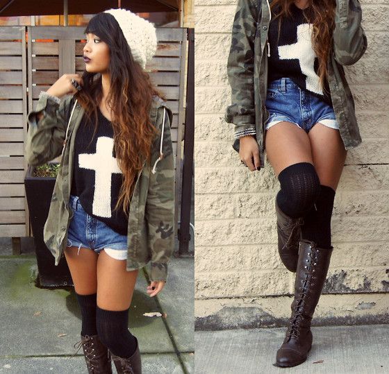 A hat does not necessarily mean winter and closed warm clothing. With a loose knitted bean, you can create an interesting youth look for the fall. Already only black with a white sweater with inflated short denim shorts will look great. However, camouflaged jackets, high knit black knee-highs and black lace-up high boots will help make the bow even more stylish.