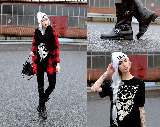 A sports cap with an inscription can easily be combined with a straight short coat in a red-black cage. Since there are already enough color spots, then as a basic clothing - a black loose T-shirt with a white print and black fitting jeans. In the fall, be sure to wear a scarf and high leather boots.