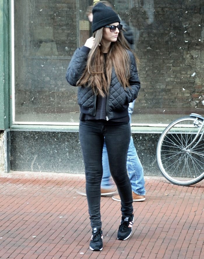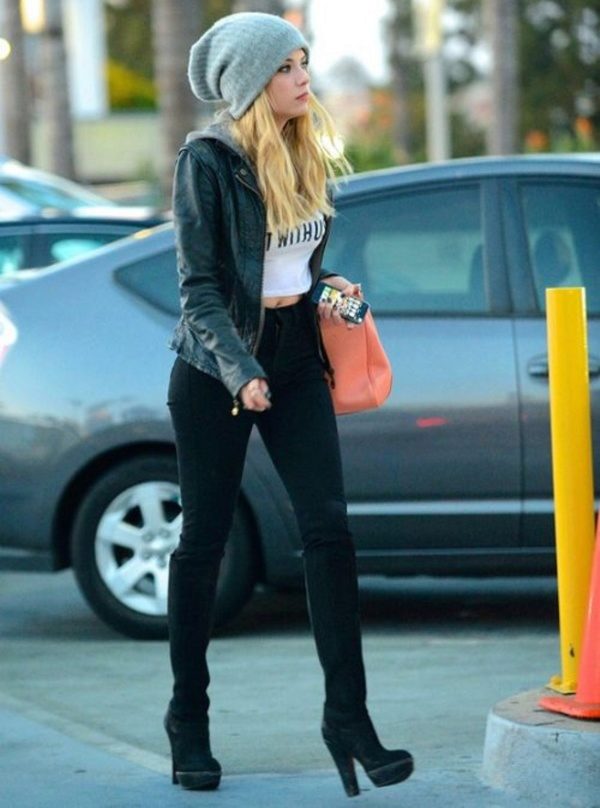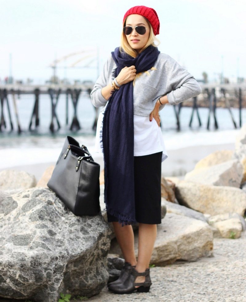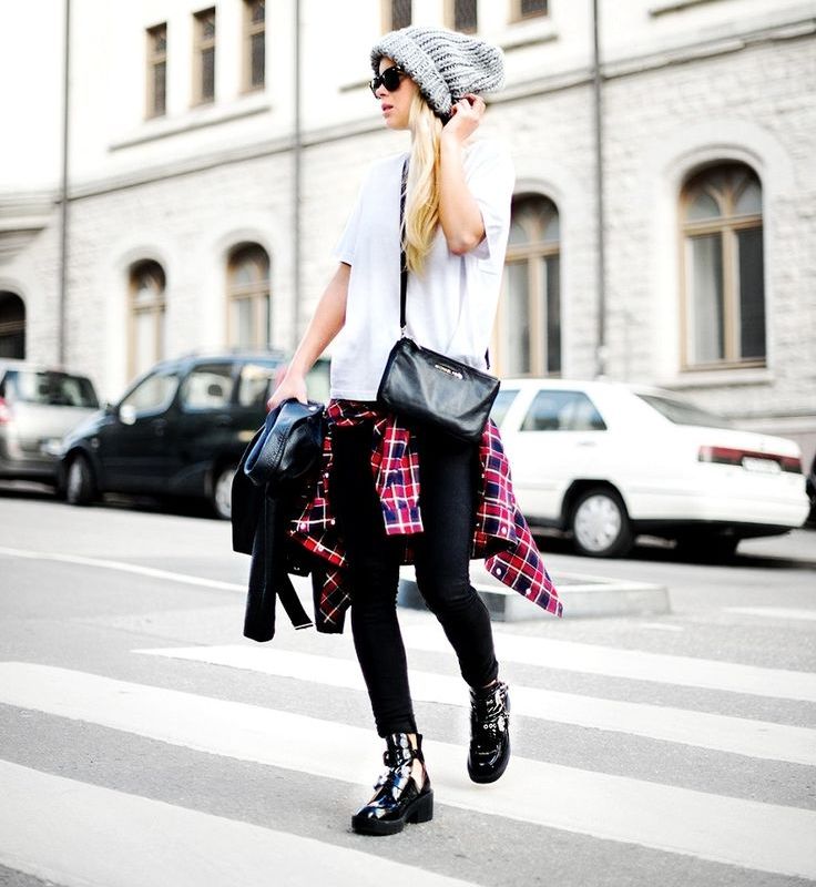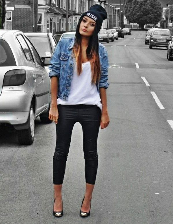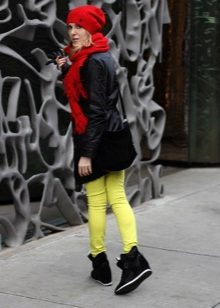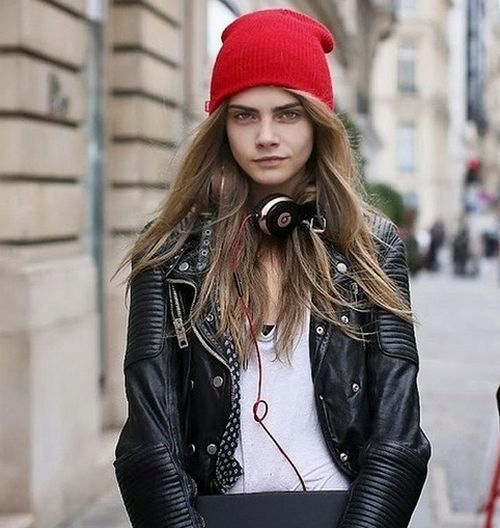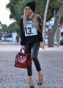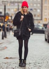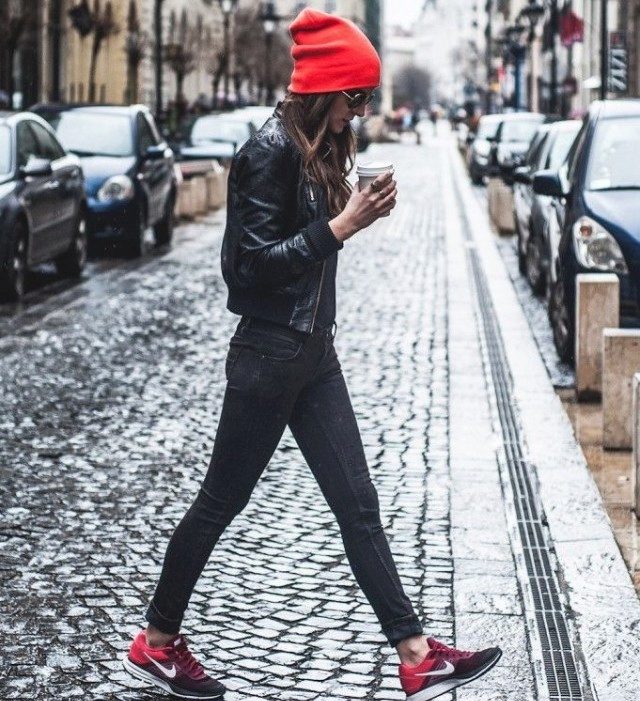 Bright beanie is ideal for thinning everyday solid bow. Black blouse and jeans, black leather, and so that the red hat does not stand out from the image, sneakers with red inserts. Well, what kind of city girl would do without large sunglasses?