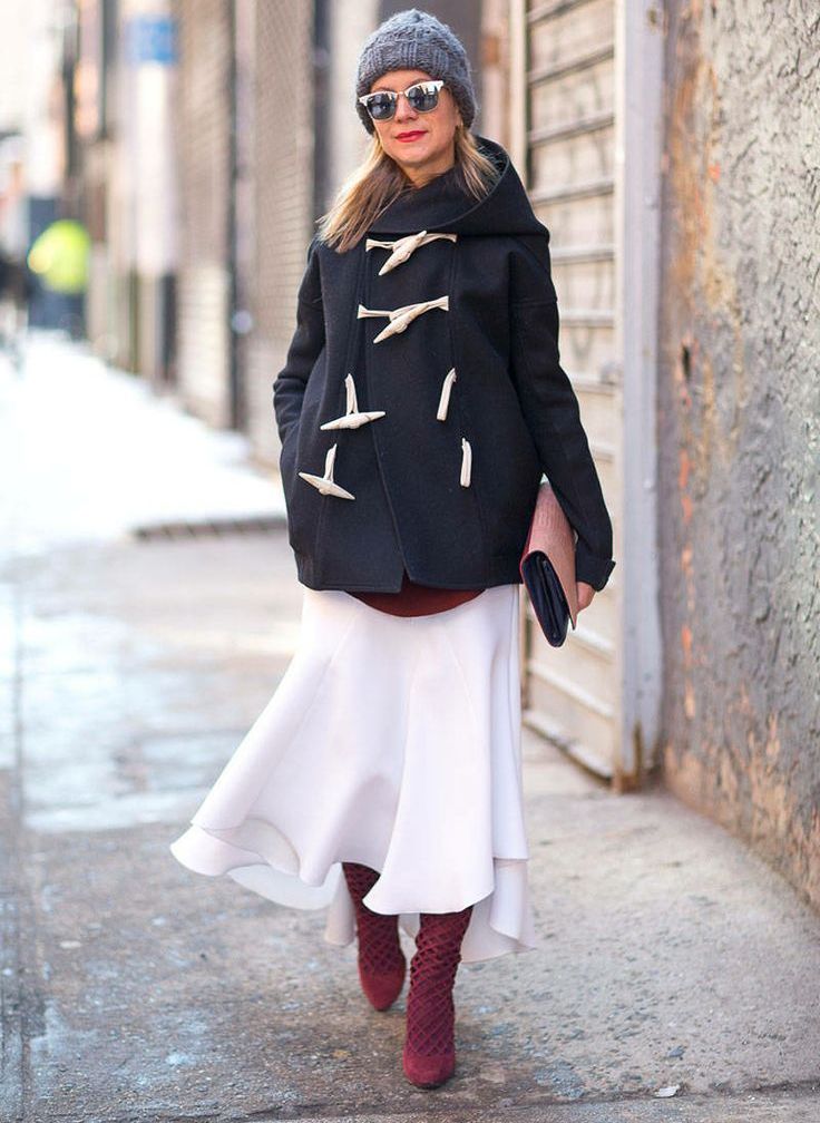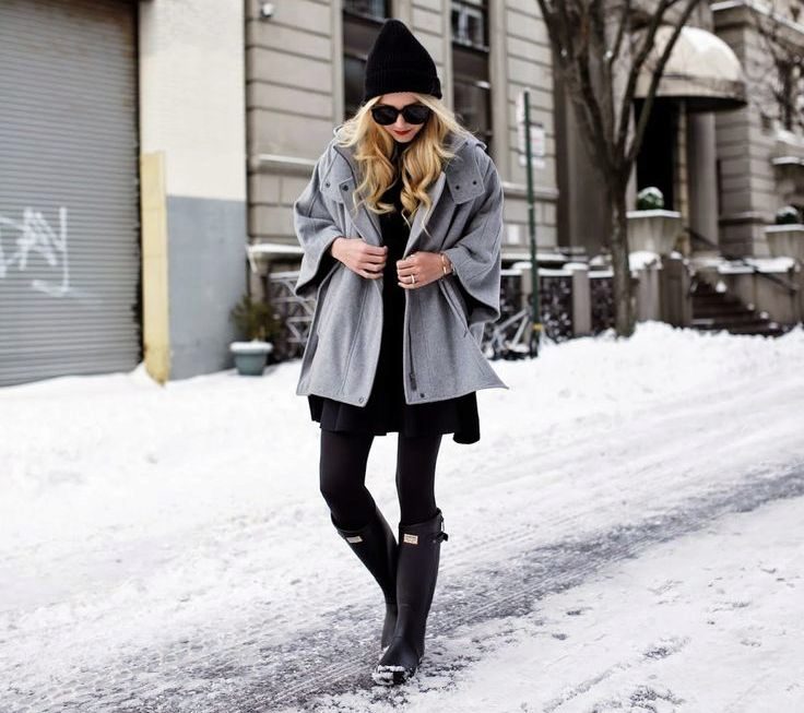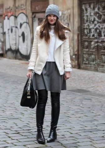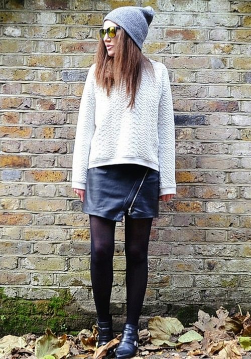A high black short skirt in combination with a short gray sweater tucked under it is a trendy youth image of this season. High knee-highs and flat-soled shoes will add coquetry, and a beige cap with a pompon and a brown bag will complete the look.