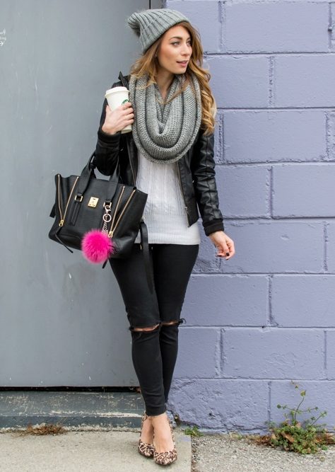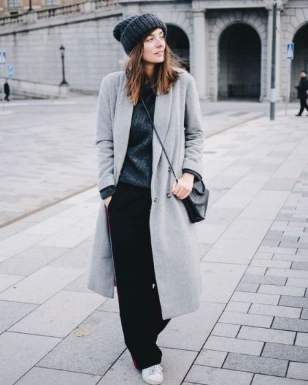 A warm dark gray sweater with black sweatpants is an ideal set for a volleyball sweater hat. The image will sparkle with new colors, if you add a gray long coat and a black crossbody bag to the sports style.