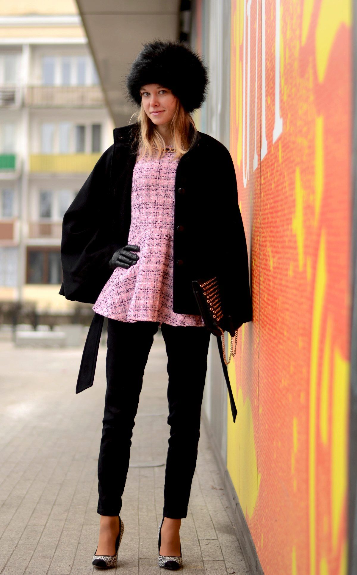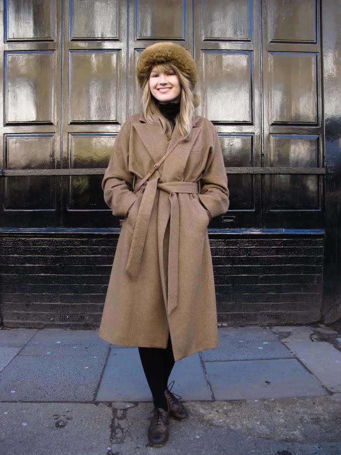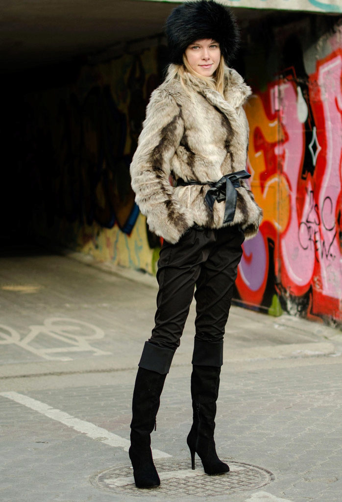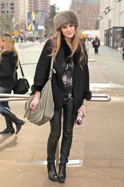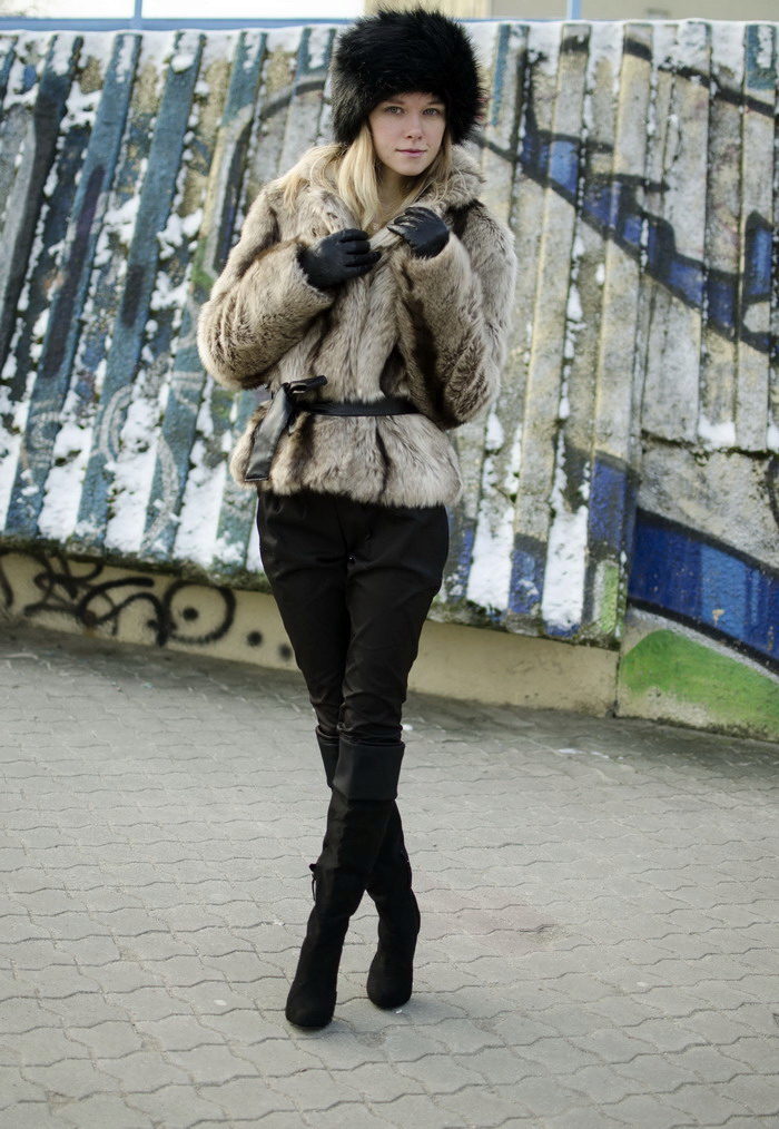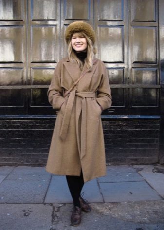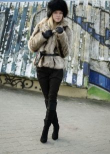 Black fluffy boyarka with a neat fur coat with a black leather belt. Beige outerwear dilutes black bows and is its main accent, because in addition to the cap, black pants and boots are worn.