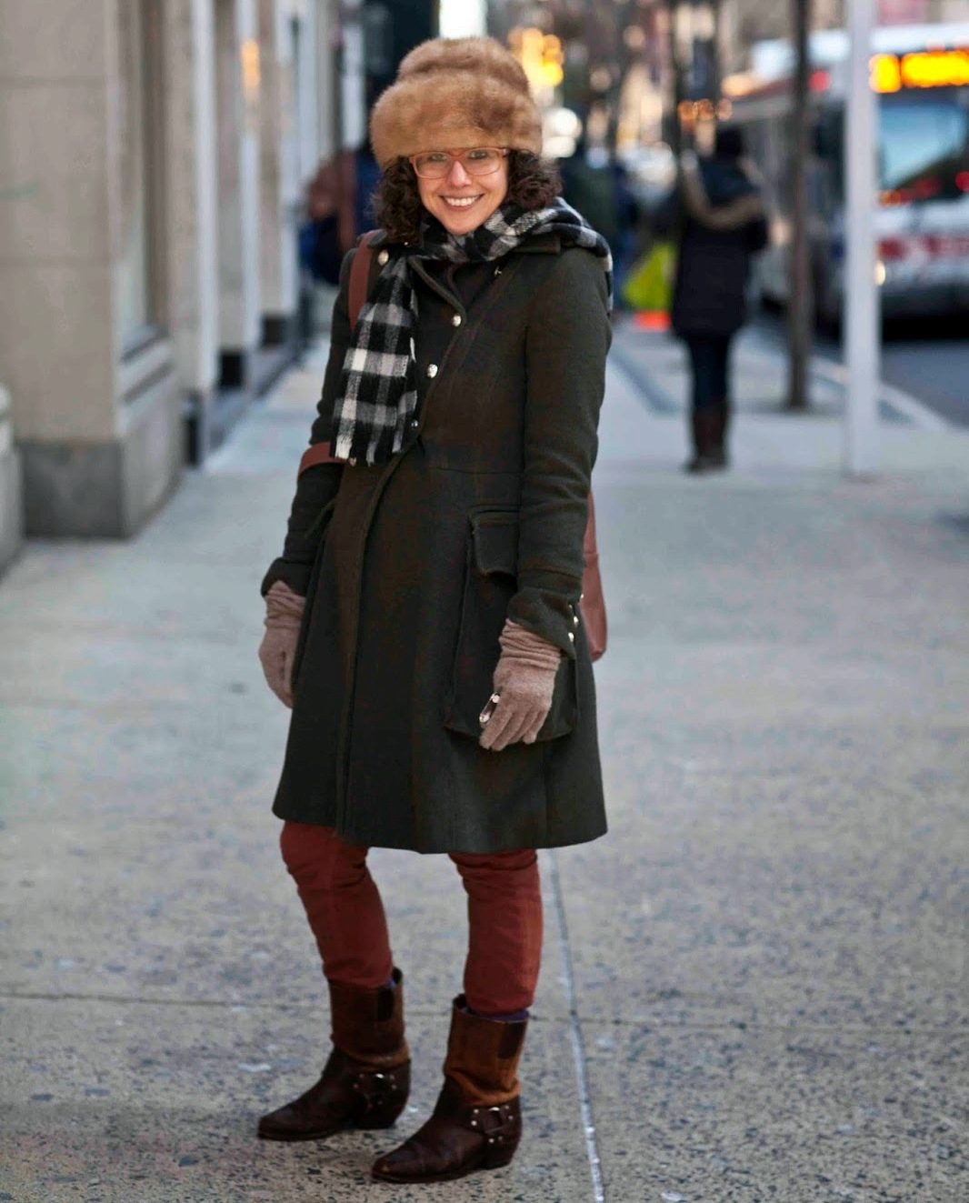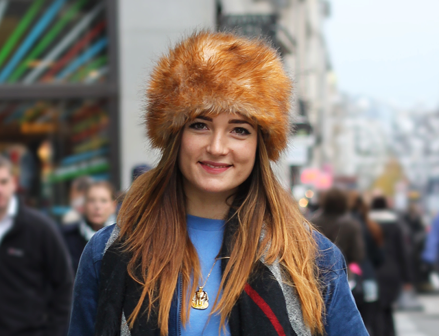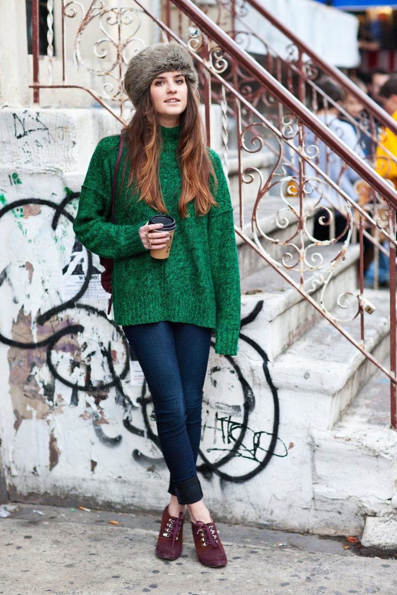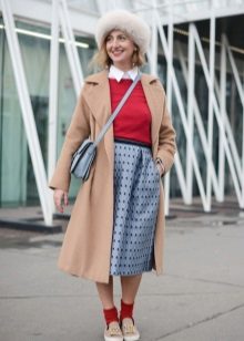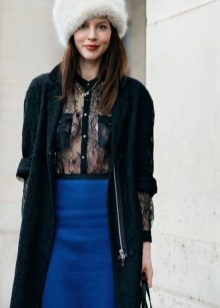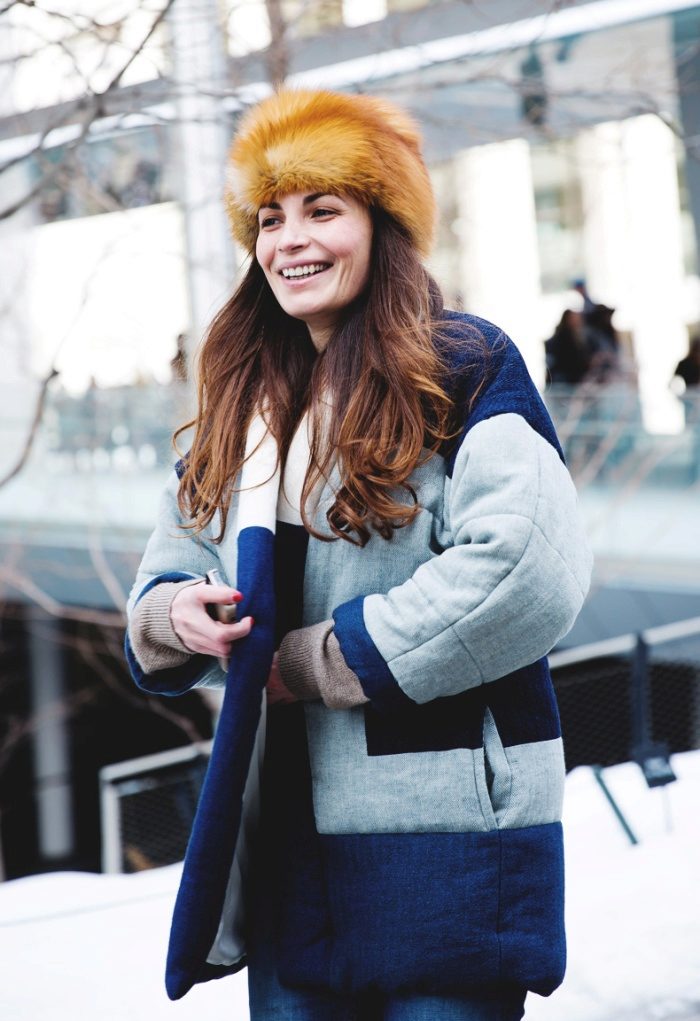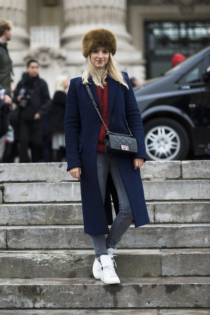 A brown non-fluffy hat will fit a long classic blue coat. Underneath is a terracotta tight sweater and gray jeans, and white sneakers on the legs. As a bag a small black crossbody.