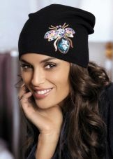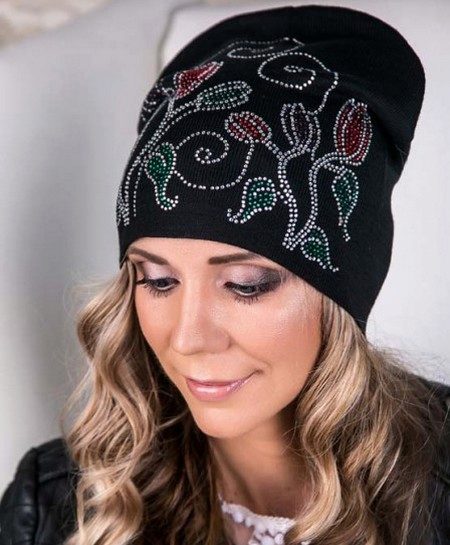 The most current decor for the black cap is the shiny elements. Since the black color absorbs light rays, rhinestones, sequins, stones, golden and silver threads on a dark background look appropriate and not gone.