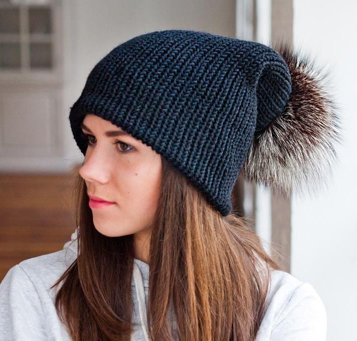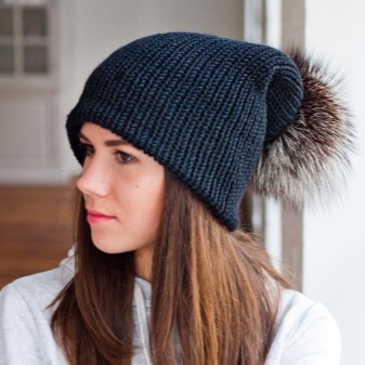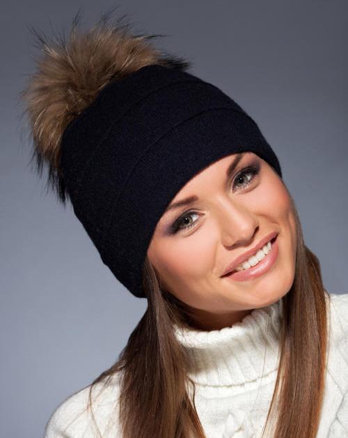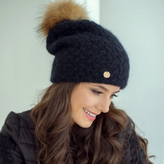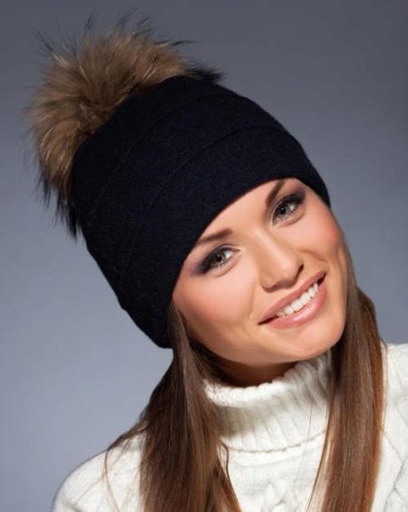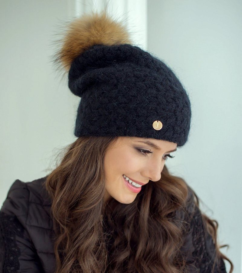 Black hat with a pompon made of natural fur is the trend of the season. This is a classic model that fits any clothing, adorns a woman with any type of appearance and looks stylish and elegant.