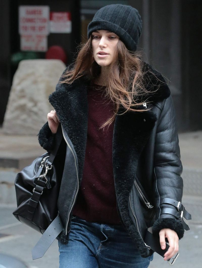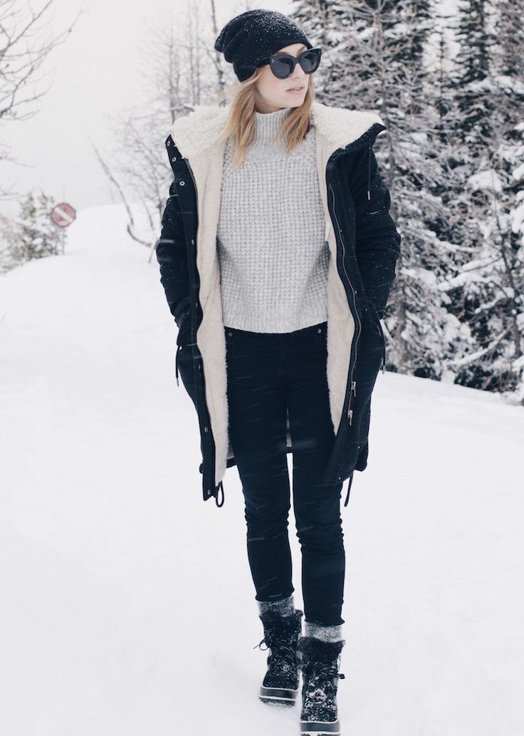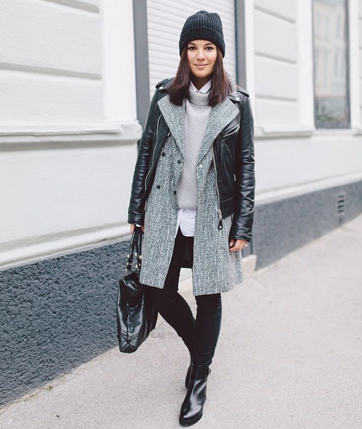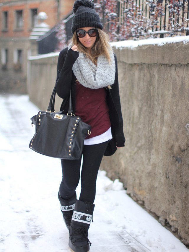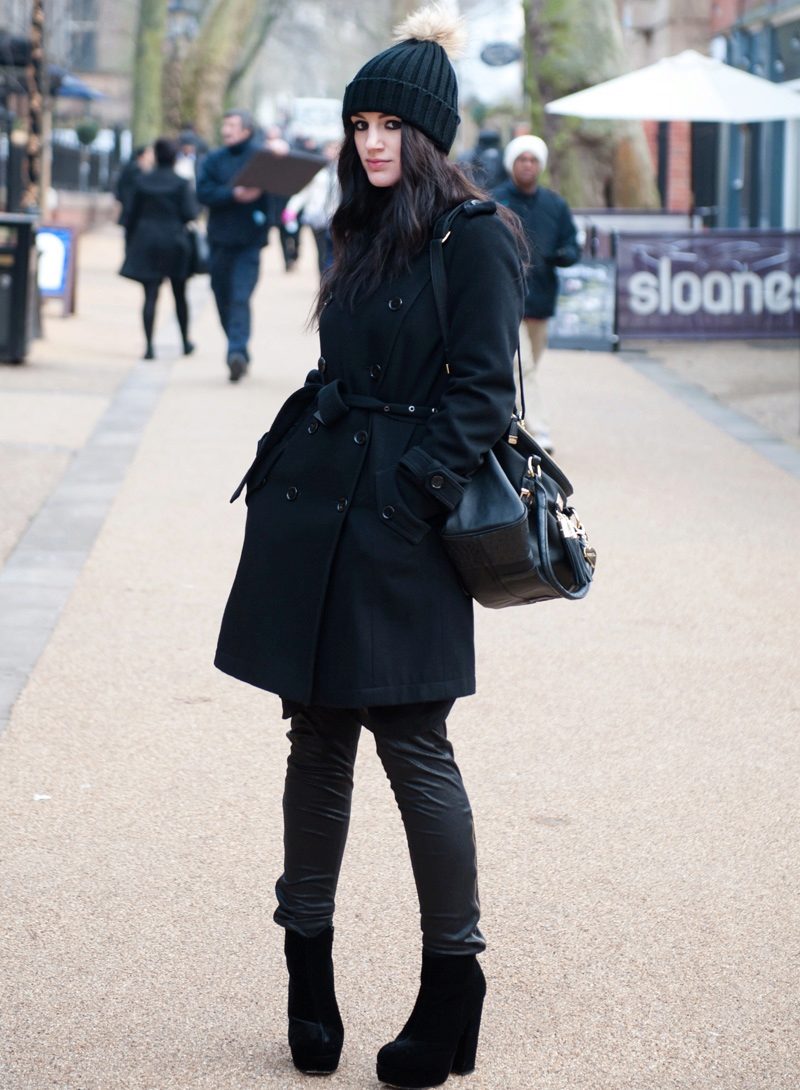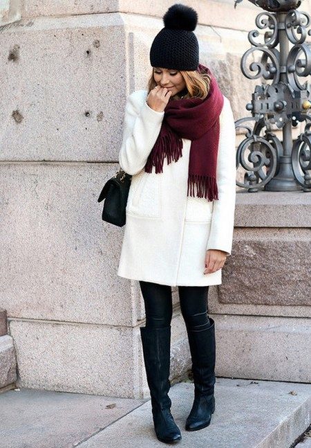 The black knitted hat with a pompon will be perfectly combined with a khaki-colored park, a dark trench coat or a bright sport jacket, and it can also be worn with a business-style coat. A laconic black beret will complement a raincoat or a fur coat, and a cap with earflaps will well complement a blown vest or a short down-padded coat.