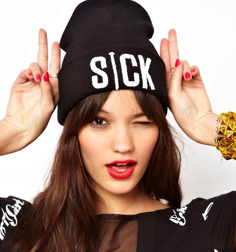 Such hats are another trend of the new season. And eminent designers, and network brands have released a lot of these caps, the inscription on which is located in the center, on the lapel, or just have a forehead. Most often, you can find provocative words like: “Go!”, “Wow”, “Sexy” and so on, brand names or whole sentences, usually praising female beauty and style.