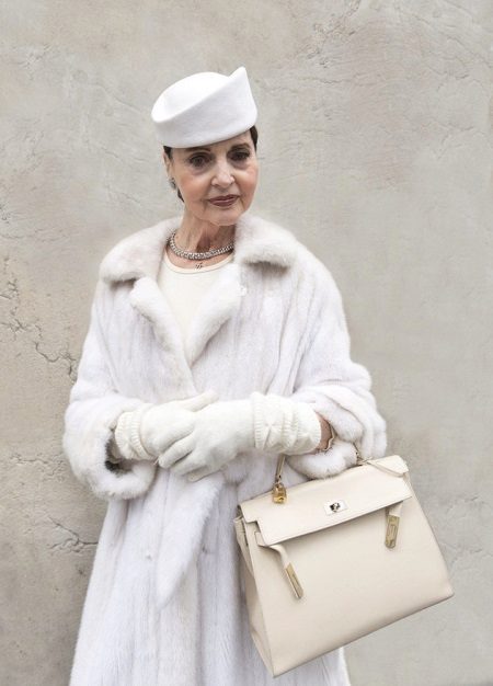 An elderly lady in an elegant beret of velvety texture resembles a true English lady who gathered for a solemn reception.A headdress that fits an oval face is shifted to the side, which makes the image more stylish. The whole ensemble is made in black color, but it goes to a woman and doesn’t get old at all. The image is refreshed by a black and white print on the lapel of leather gloves and noble pearl jewelry. The make-up of a woman is bright enough, but at the same time not vulgar.