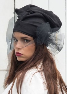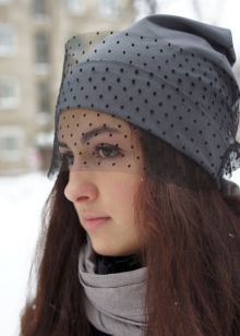 A feminine hat with a veil will add extravagance and elegance to the image. The color of the accessory should be chosen in accordance with the shade of outerwear. Universal fabric in harmony with a variety of textures. The cap can be supplemented with a finishing made of fabric, fur or accessories.