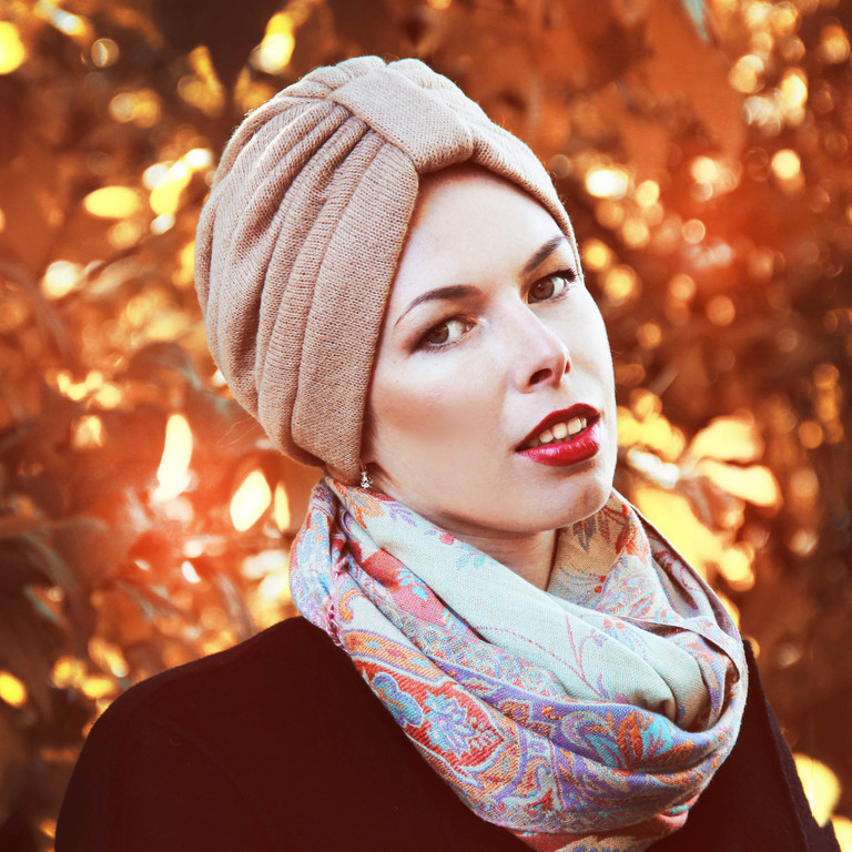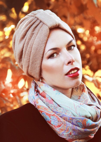 This year, the trendy shades of the color palette for a turban hat are saturated maroon and blue, as well as delicate green, pink and brown tones. However, the most popular option is a versatile and elegant beige cashmere hat of this style.