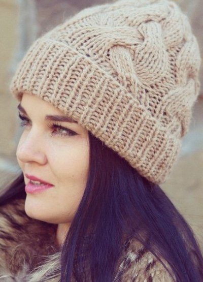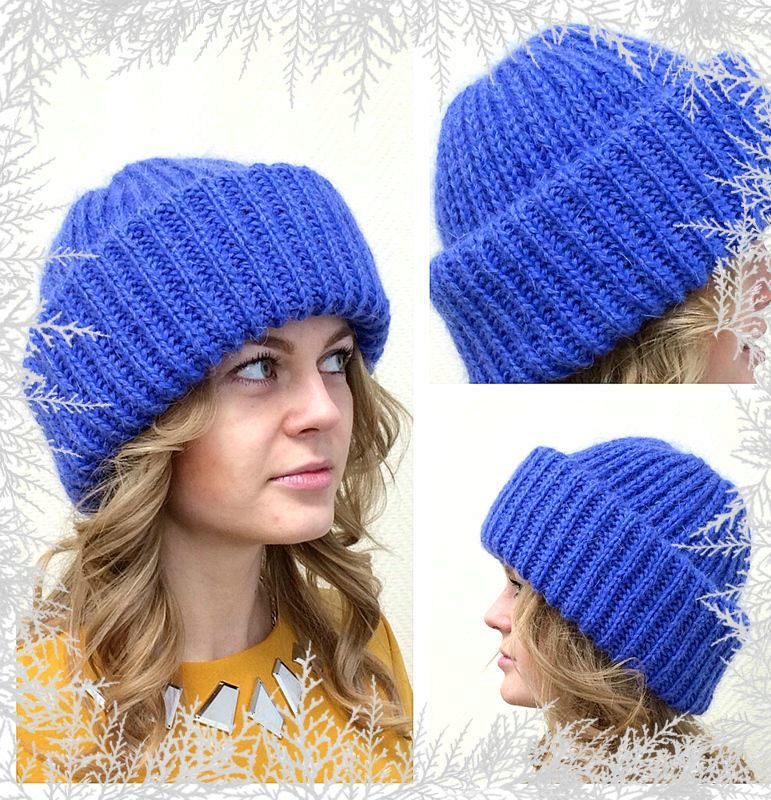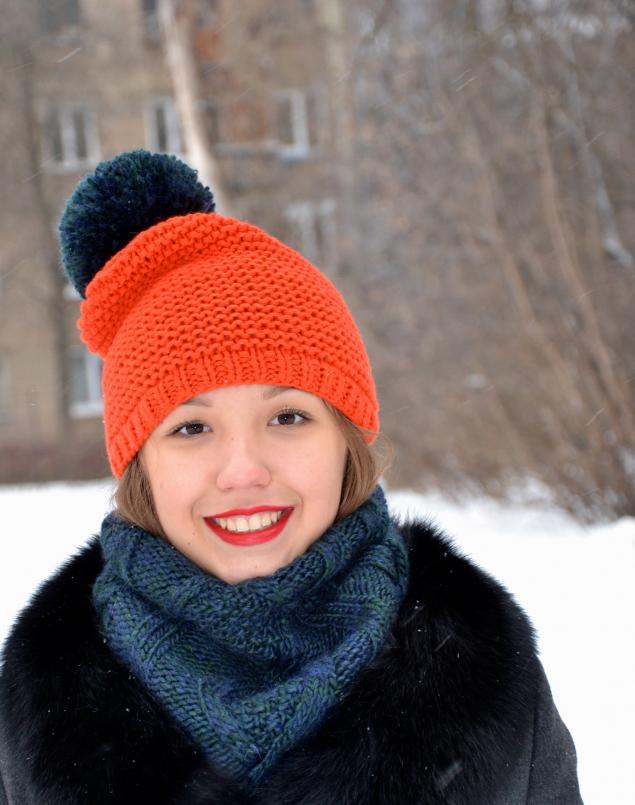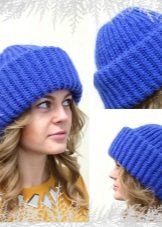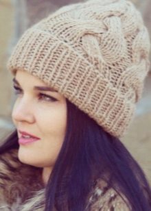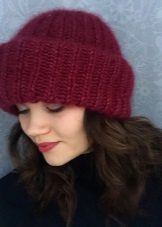 The cap of the usual form with cuffs, can be worn with any kind of outerwear: with a fur coat, jacket, coat. Also from the pros one can note the universal size of the cap - thanks to the knitting, the canvas can stretch to the necessary volumes. And of course, the abundance of colors of yarn and, accordingly, headwear makes it possible to choose a product for any color of clothing.