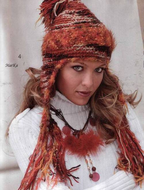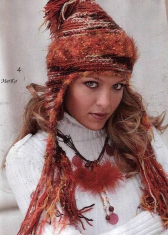 There are many models of headgear: made with large knitting, decorated with knitted flowers, made using the "braid" technique. Very elegant looking cap with cuffs. This model is suitable for women of mature age. Ideal with a classic coat or sheepskin coat. Such a cap may have several flaps: one, two, or three. In any case, this is an excellent protection against blowing ears.