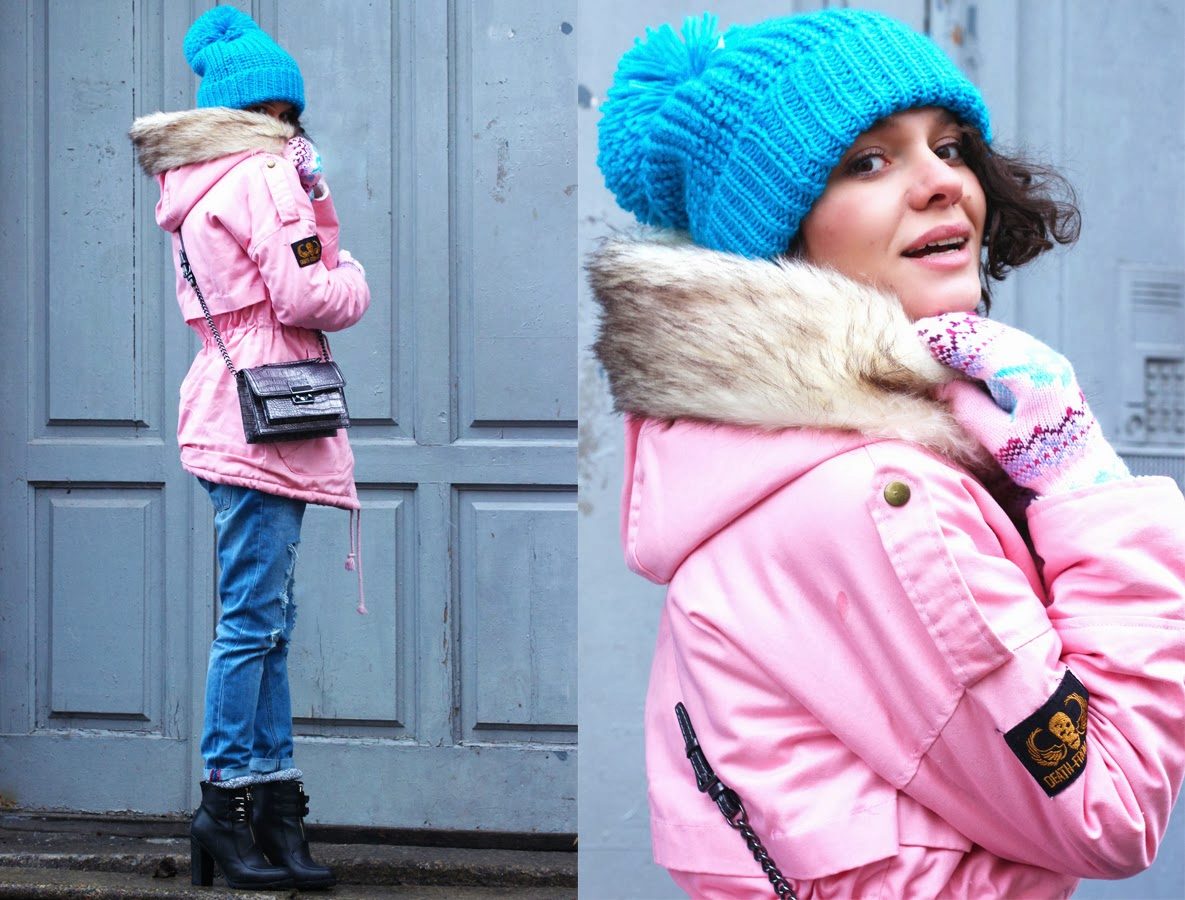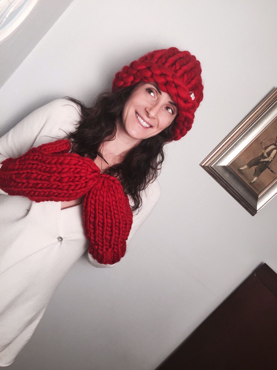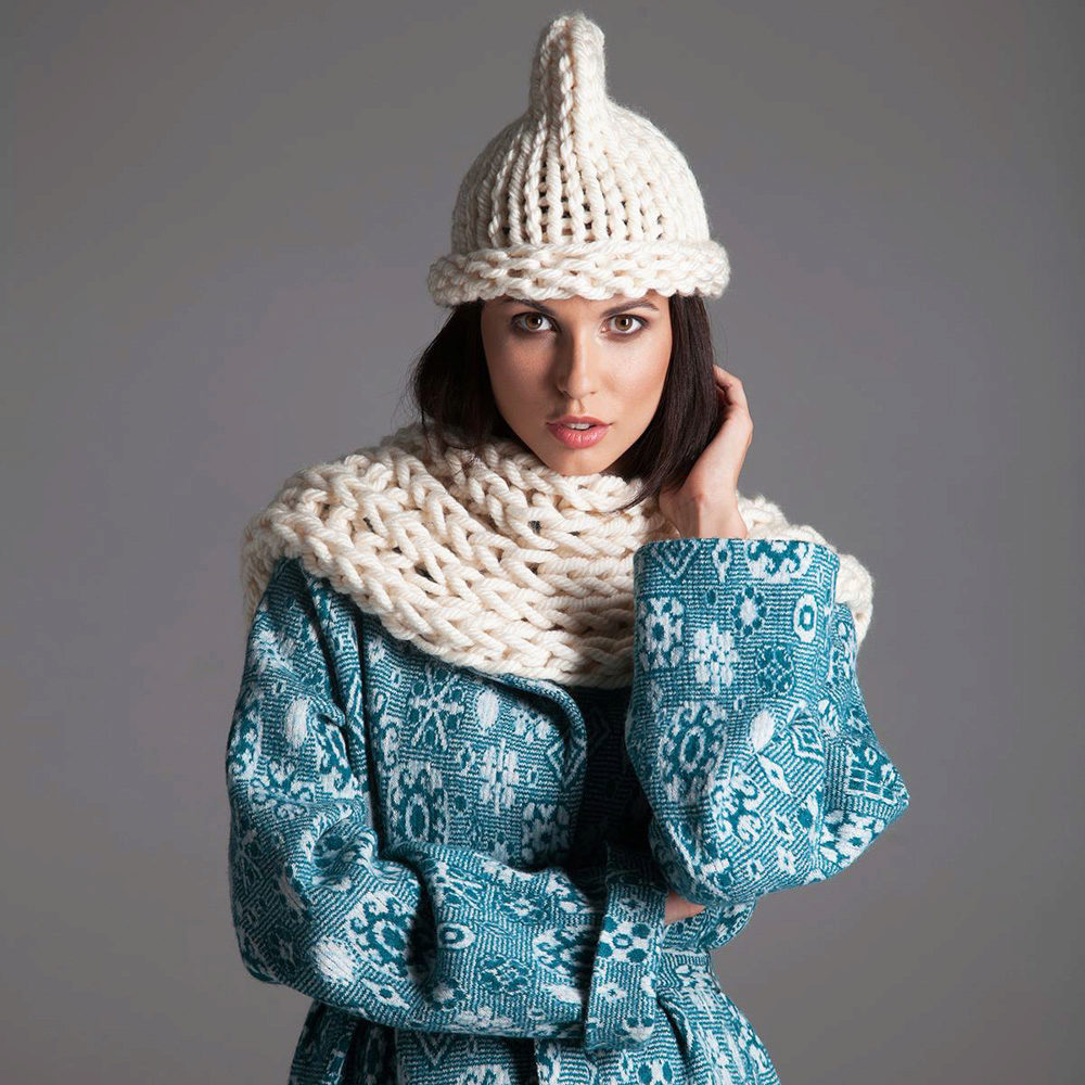 When choosing outerwear for a thick-knitted hat, it is better to choose the most discreet concise styles.