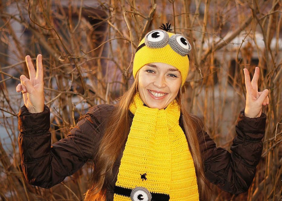 The first girl shows us a cheerful spring look in the style of minions. A set of a knitted hat and a yellow scarf with the addition of character attributes (a peephole with glasses and “hairstyle”) rejuvenates the character of the photo, demonstrating her friendly nature and openness. To such bright accessories she picked up a dark jacket, perfectly combined with funny faces.